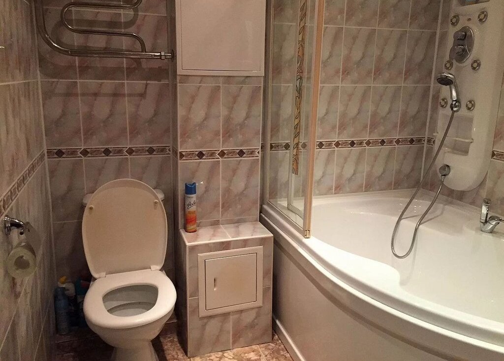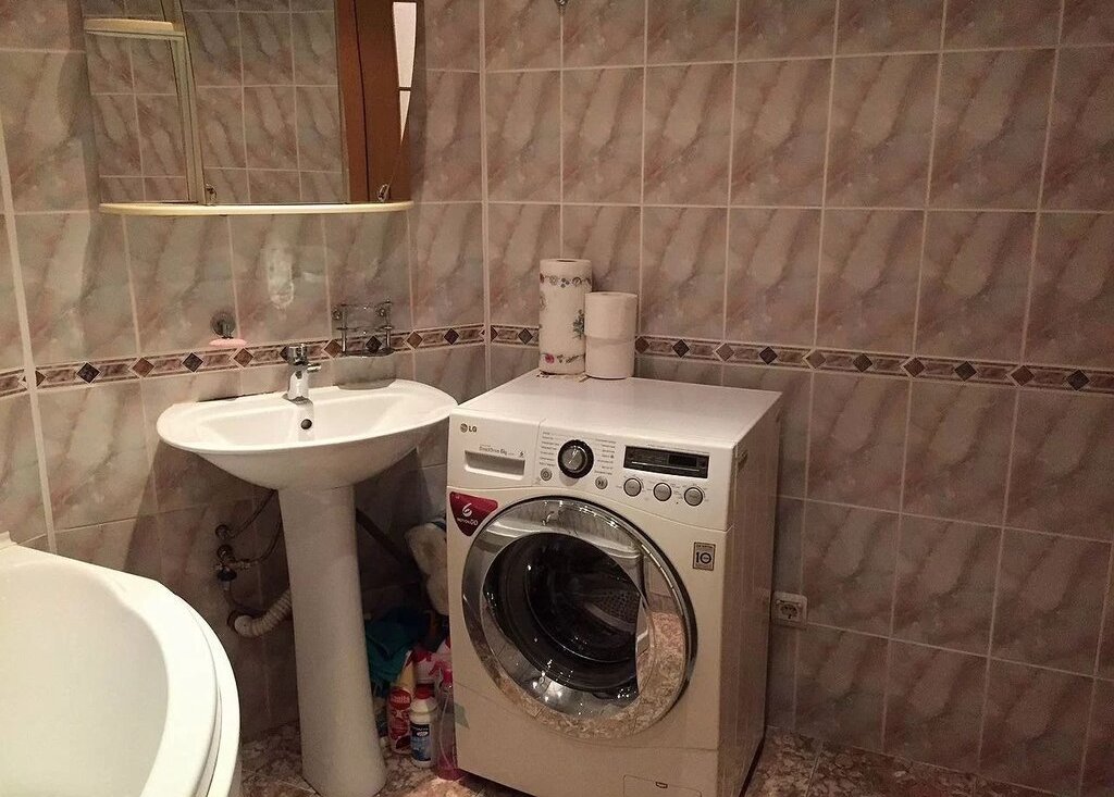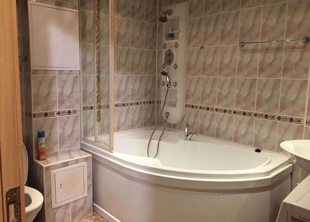 Санузел (5 кв.м.): большая угловая ванна, стиральная машина.