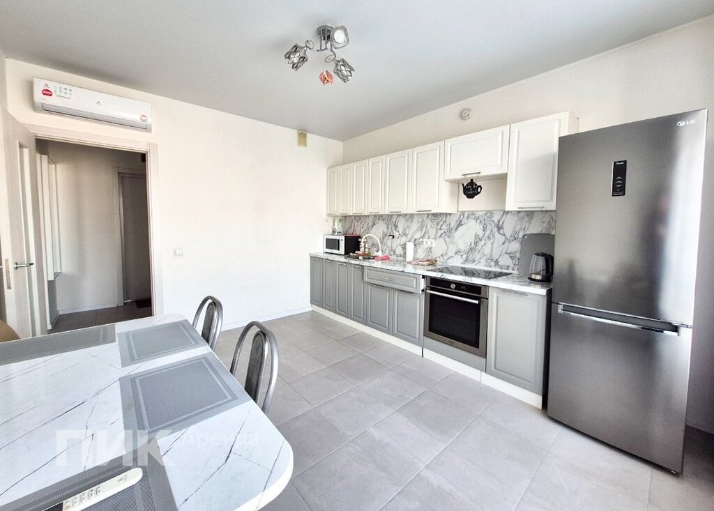 В квартире сделан евроремонт, на полах уложены ламинат и плитка. Для комфортного проживания есть необходимая мебель, кухонный гарнитур со встроенной техникой, а также: