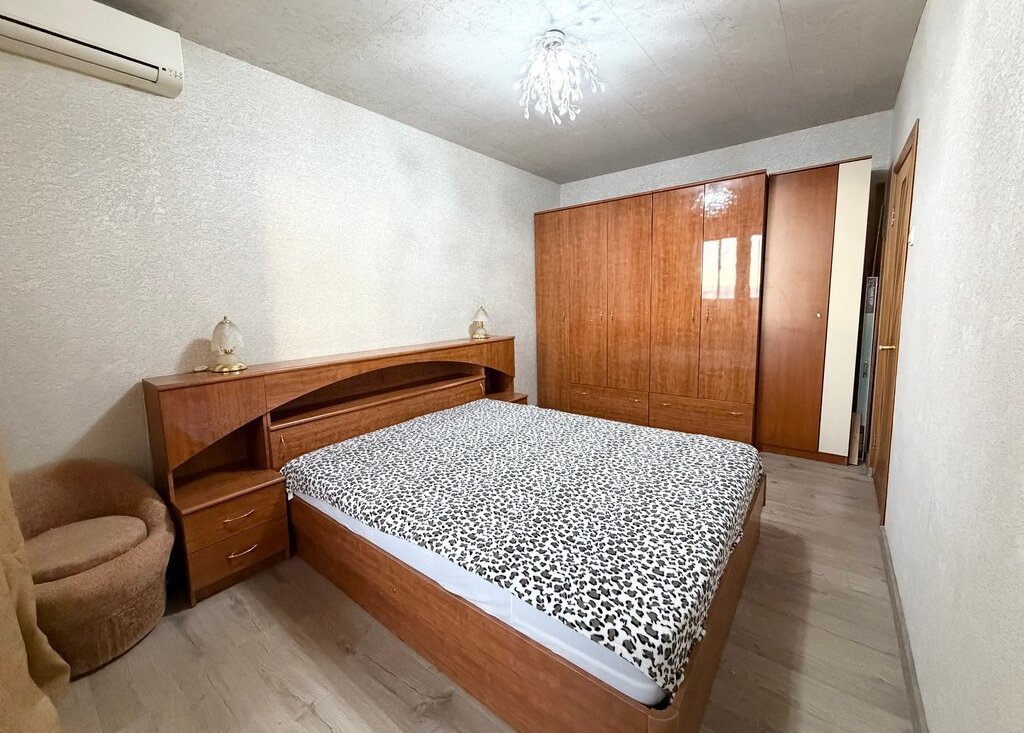 Спальня 13 кв м: двуспальная кровать с ортопедическим матрасом, прикроват тумбочка, кресло, 2 платяных шкафа, кондиционер General climat.