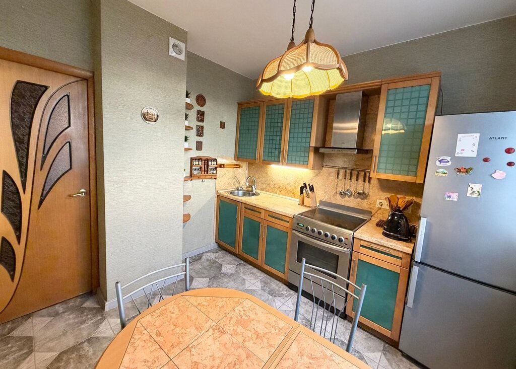 Кухня 9 кв м: встроенный кухонный гарнитур с бытовой техникой: электроплита с духовкой ARDO, вытяжка Elikor, холодильник Atlant, микроволновка BBК, чайник, ТВ LG, обед расклад стол, уголок, 4 стула.