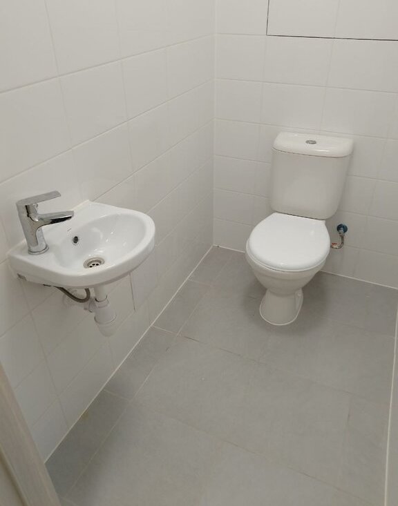 Просторный раздельный санузел с 2 унитазами и 2 раковинами.