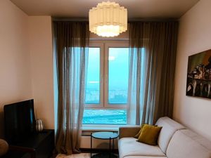 Красивая 2х комнатная квартира: студия-гостиная и спальня. Большая полностью оборудованная кухонная зона, небольшая гардеробная, два остекленных балкона: один технический, другой утепленный с ротанговой мебелью. Встроенный холодильник, посудомоеечная и стиральная машины, теплый пол в ванной и коридорной зоне, кондиционер. Во дворе несколько новых детских площадок и огороженная баскетбольная площадка. Выход из подъезда прямо на зеленую набережную Москвы-реки (невероятно удобно для любителей велосипедных прогулок, роликов и бега - мы за 25 минут на великах доезжали до Кремля :)). Собственники.