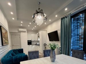 Квартира с очень красивым и лаконичным дизайном располагает большой кухней-гостиной, отдельной спальней и совмещённым санузлом. Все выполнено из дорогих и качественных материалов. Шкафы до потолка позволяют использовать пространство с максимальной пользой. 3 панорамных окна дают много света. На безупречной белой кухне вся необходимая встроенная техника: холодильник Liebherr no frost; посудомоечная машина, варочная панель, духовой шкаф и микроволновка Bosch; стиральная машинка с функцией сушки Electrolux.