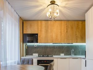 Отдельная спальная комната (секретная дверь под шкаф), гардеробная (дверь-зеркало). Смежные кухня и гостиная