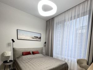 Квартира полностью меблирована и готова к проживанию. Планировка: кухня/гостиная, спальня с гардеробом, кабинет/детская, большой санузел, постирочная, большая кладовая комната, коридор с огромным гардеробом.