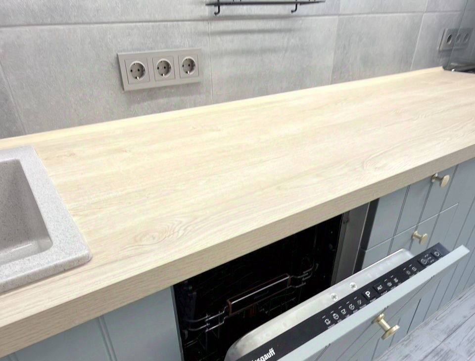 Кухня просторная, с современным гарнитуром и встроенной техникой.