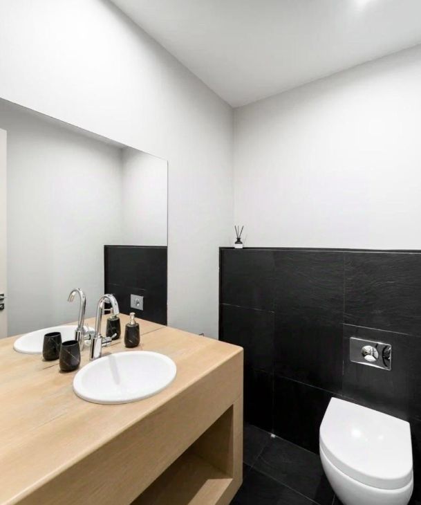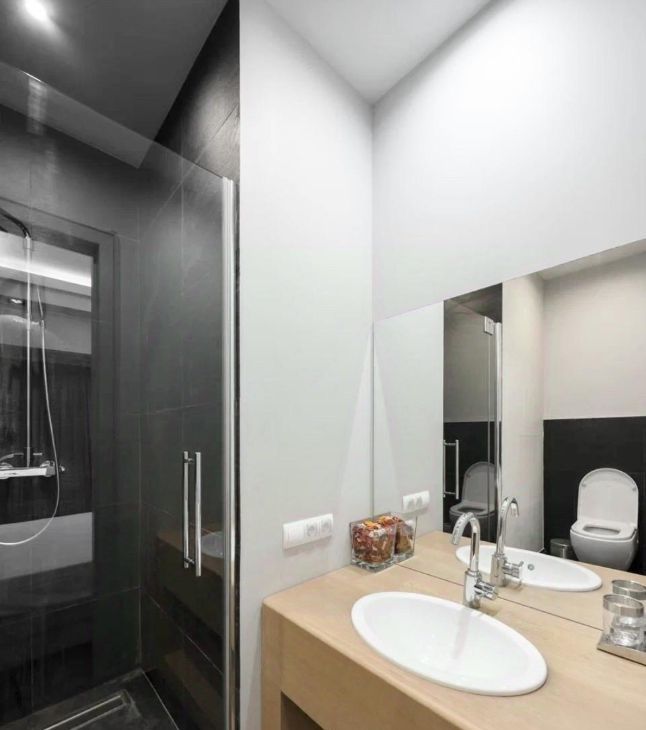 В квартире есть все необходимое для комфортного проживания. Просторная кухня площадью 25 кв. м оснащена современной мебелью и полным комплектом техники: кондиционер, холодильник, посудомоечная машина, телевизор и стиральная машина. В каждом из трех совмещенных санузлов есть ванна и душевая кабина. Это удобное решение для семьи или компании из нескольких человек.