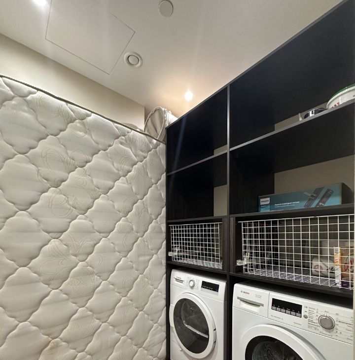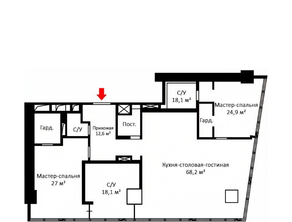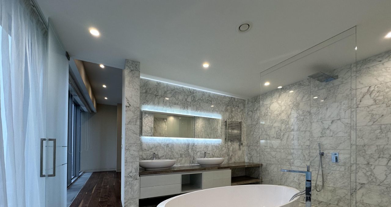 Планировка включает в себя: просторную гостиную в едином пространстве, обеденную зону и кухню. Две мастер-спальни с гардеробными и ванными комнатами, гостевой санузел, постирочная.