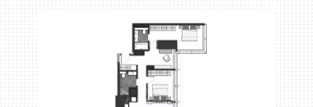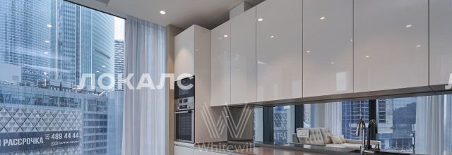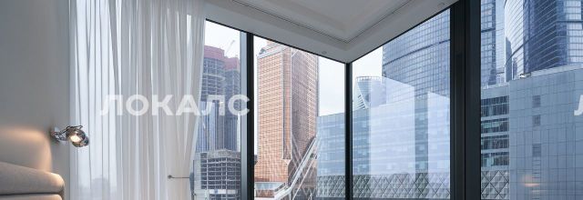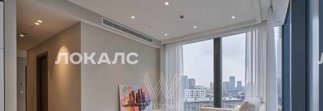 Планировка: гостиная с кухонной зоной, спальня с ванной комнатой, вторая спальня, холл с зоной кабинета, гостевой санузел. Высота потолков 3,5 метра. Установлена кухня со встроенной бытовой техникой и новая мебель. Панорамные окна ориентированы на юг и восток, с видом на башни "Москва-Сити" и город.