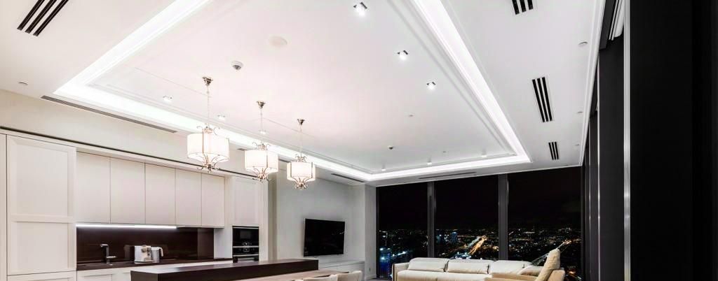 Современный интерьер, где продумана каждая деталь. Панорамные окна в пол делают город частью вашего декора.