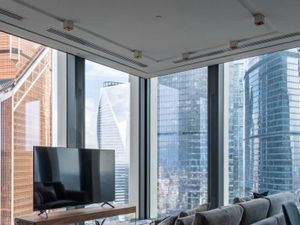 Функциональные апартаменты с современной отделкой, панорамным остеклением, полностью укомплектованы бытовой техникой, мебель под клиента. Планировка: гостиная с кухней, 2 спальни, ванная с сантехникой, холл с гардеробными. В ночное время огни небоскребов никого не оставят равнодушными.