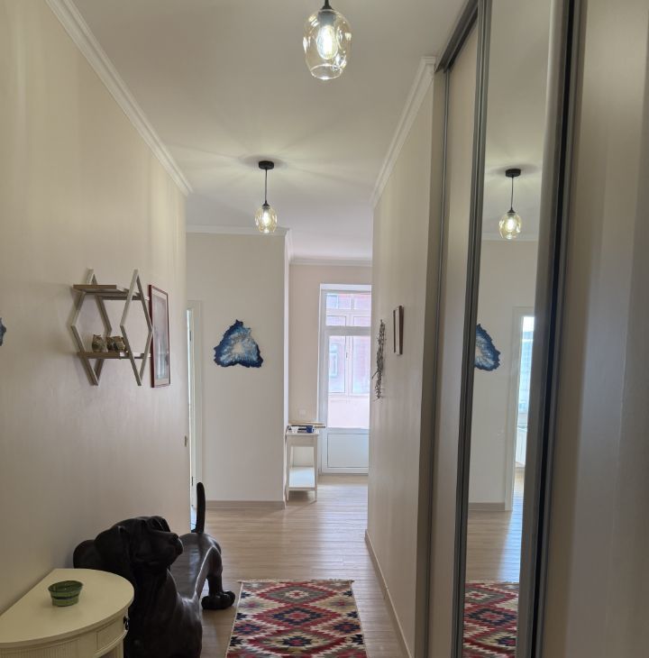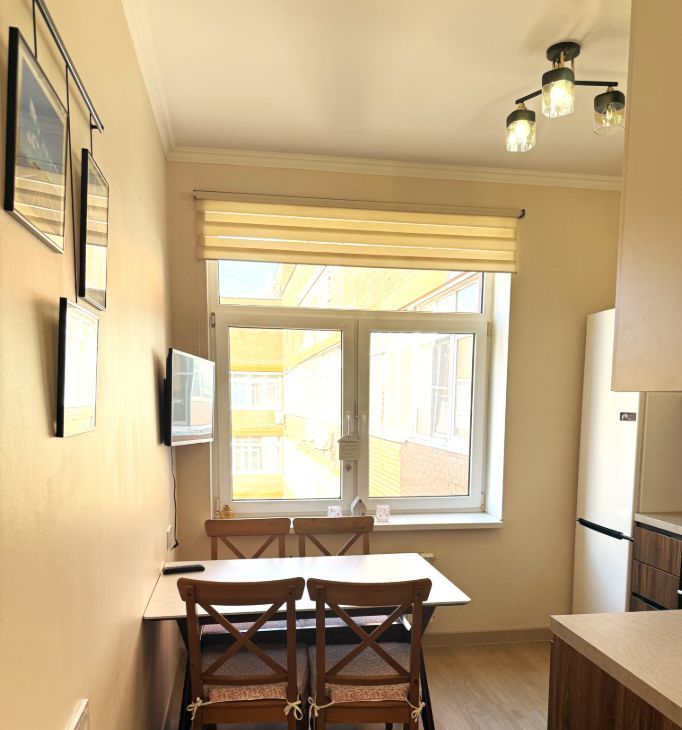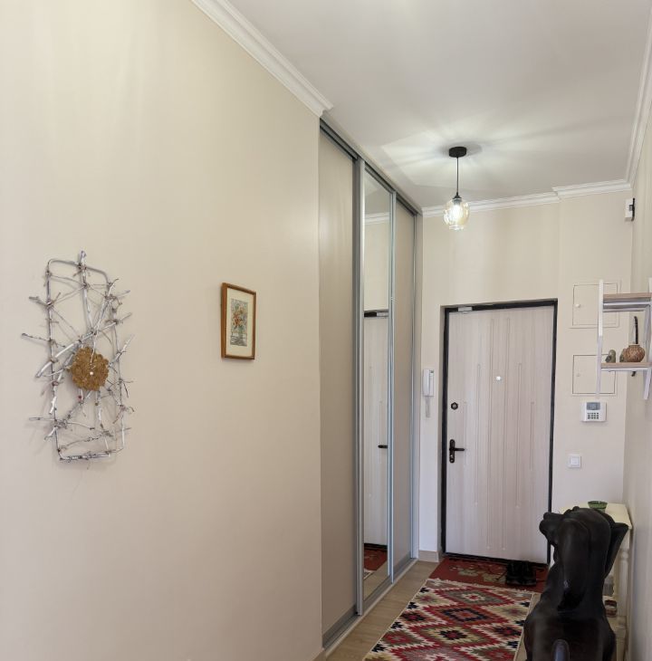 В квартире полный свежий ЕВРО ремонт. Все комнаты изолированные, имеется кладовая-гардеробная комната, застекленная лоджия. Новая дорогая гарнитурная мебель: просторная гостиная, спальня и детская. На кухне новый встроенный гарнитур, вся бытовая техника: холодильник, духовой шкаф, электрическая плита, вытяжка, установлен фильтр для воды. Сан узел совместный с душевой кабиной, установлена новая стиральная машинка автомат. Просторная прихожая, установлен кондиционер, при входе в квартиру встроенный шкаф- купе для верхней одежды. Приличный чистый подъезд после ремонта, хорошие соседи.