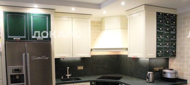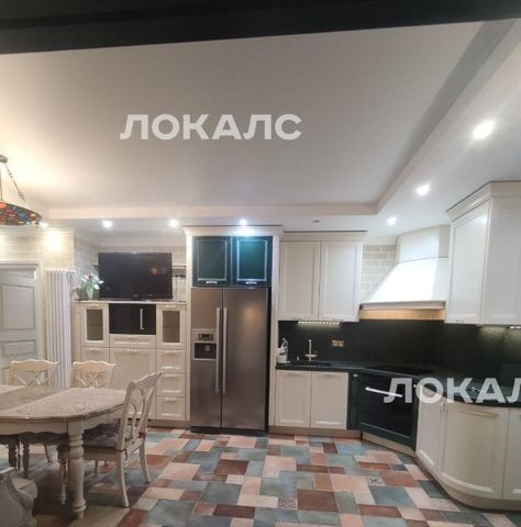 Кухня-столовая (23 кв.м) оборудована всей техникой: варочная поверхность, духовка, микроволновая печь, посудомоечная машина, двухдверный холодильник с ледогенератором, винный шкаф, телевизор. Кухонный гарнитур массив, каменная столешница. Раскладывающийся стол, 6 стульев, французский диван.