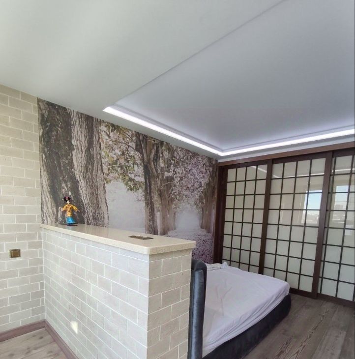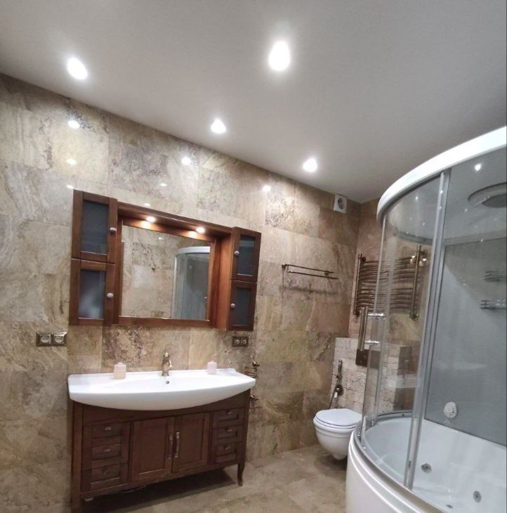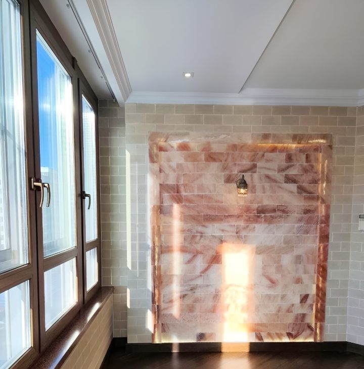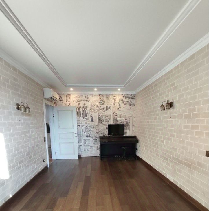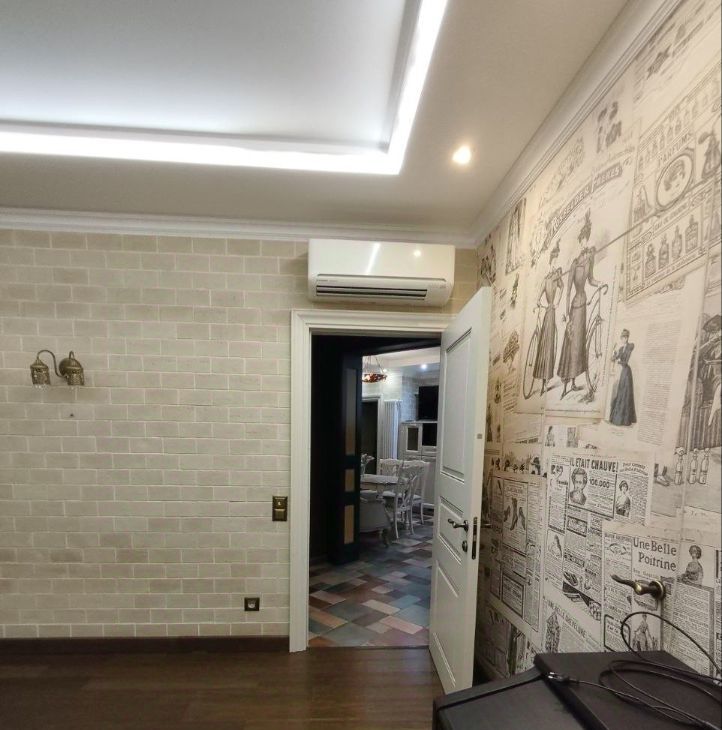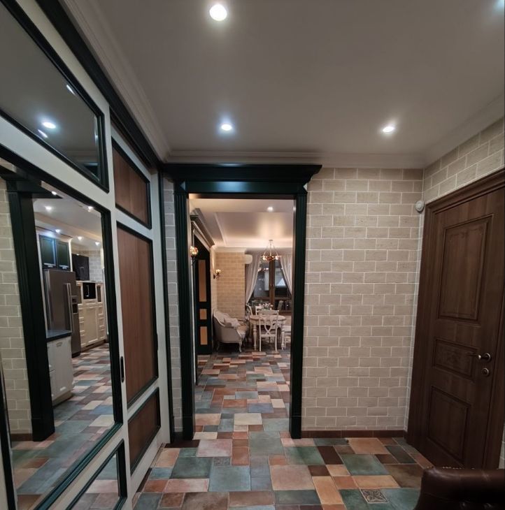 Отделка стен-декоративный кирпич. Итальянские межкомнатные и входные двери. В гостиной стена из тибетской соли с подсветкой (Соляная пещера). В кухне и прихожей на полу итальянская плитка. Ванные комнаты отделаны тремя видами травертина.
