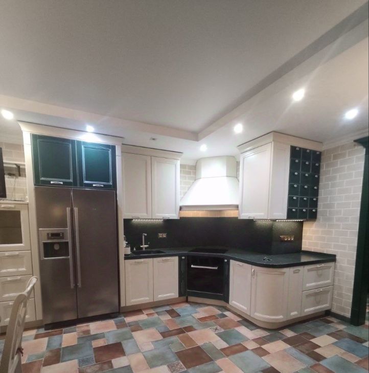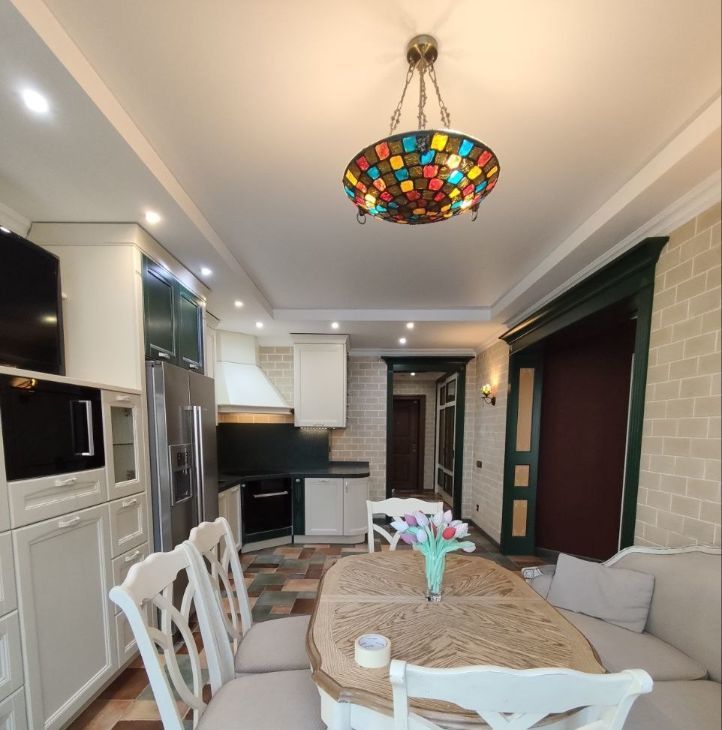 Кухня-столовая (23 кв.м) оборудована всей техникой: варочная поверхность, духовка, микроволновая печь, посудомоечная машина, двухдверный холодильник с ледогенератором, винный шкаф, телевизор. Кухонный гарнитур массив, каменная столешница. Раскладывающийся стол, 6 стульев, французский диван.