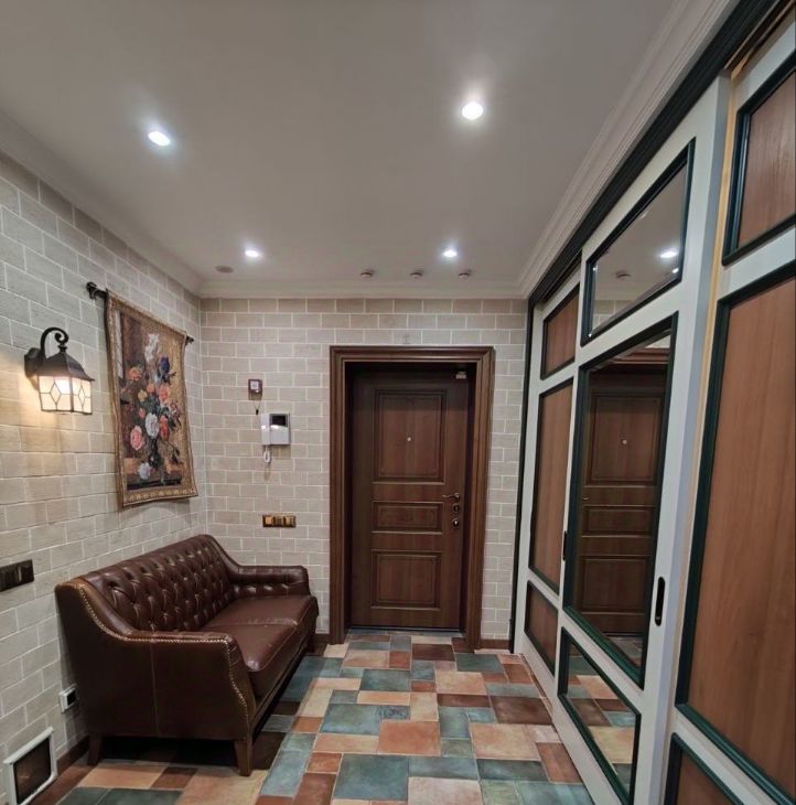 В прихожей (10 кв.м) еще одна гардеробная, кожаный диван.