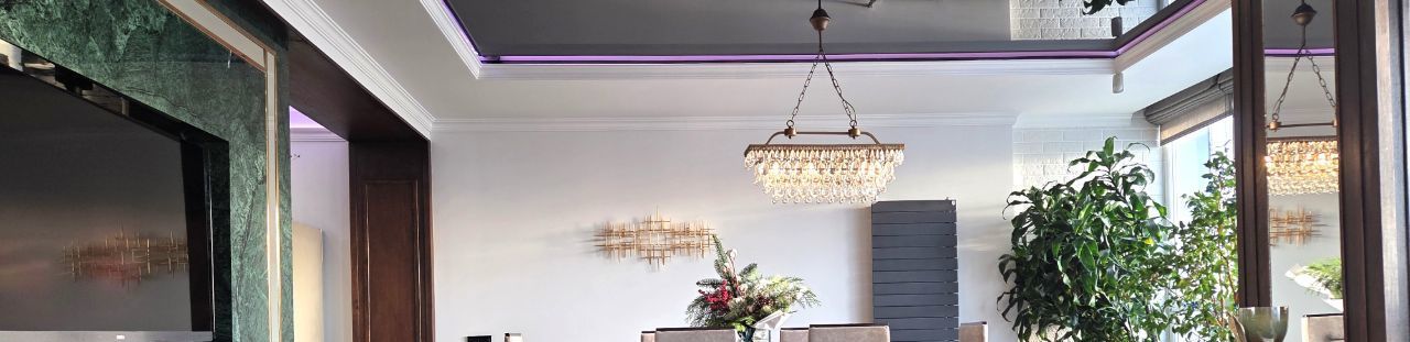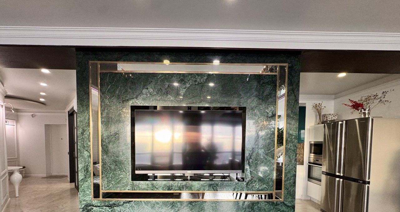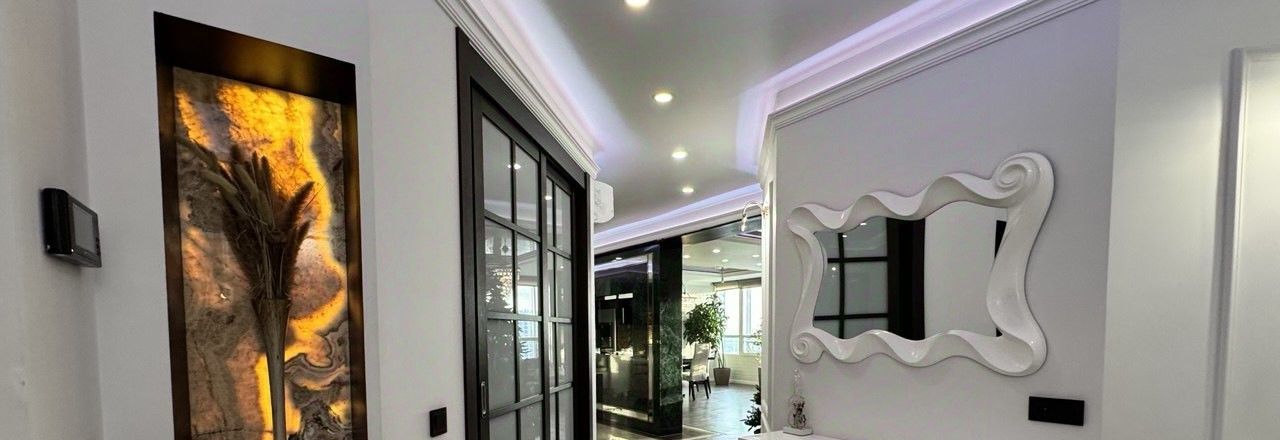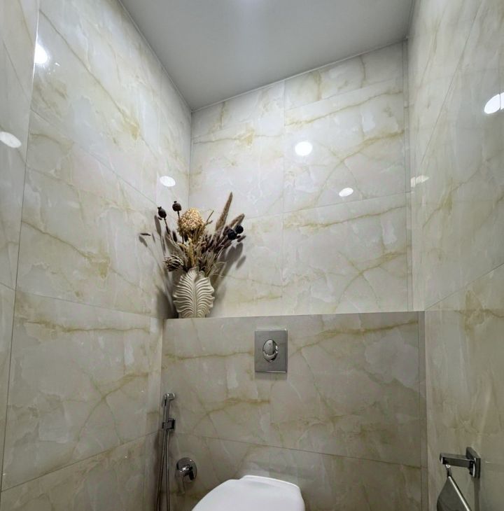 Главное место в квартире — гостиная 56 кв.м с мраморным порталом и биокамином, создающим атмосферу загородного дома в городских условиях. Пространство идеально для приёма гостей и семейных вечеров.