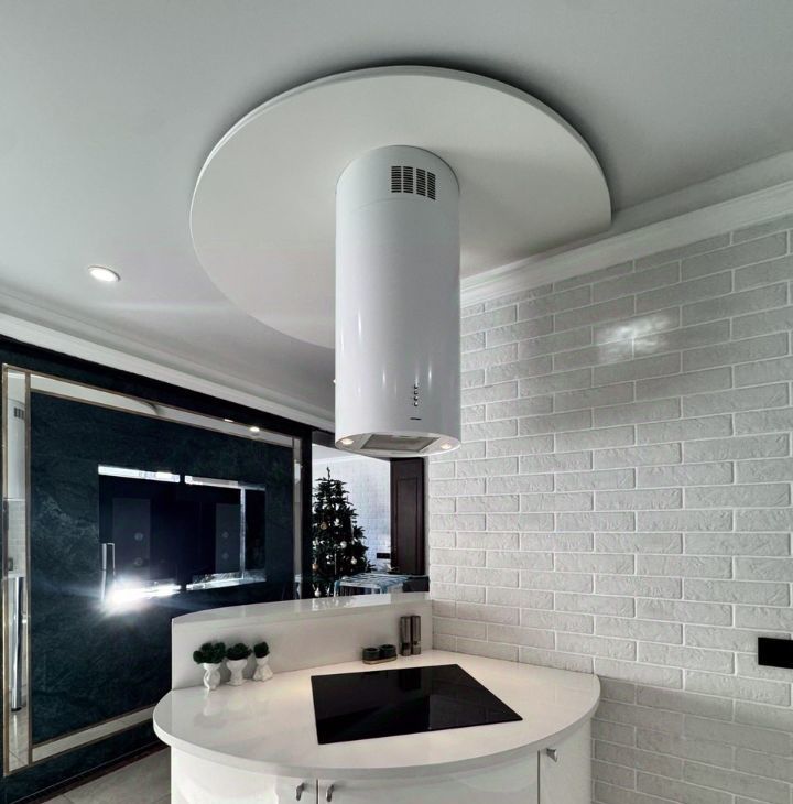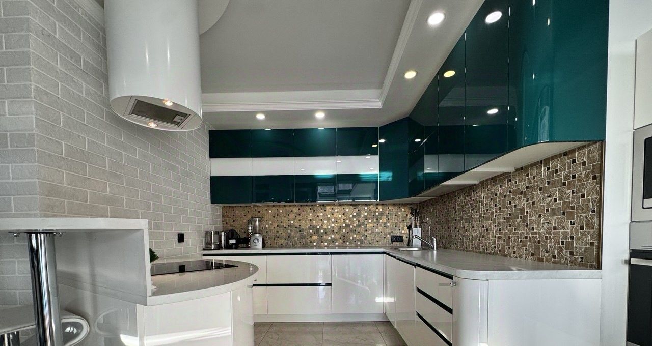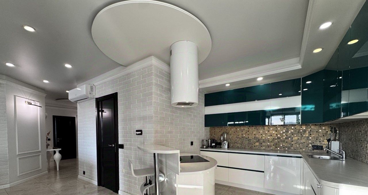 Кухня полностью укомплектована встроенной техникой: посудомоечная машина, духовой шкаф, СВЧ, двухстворчатый холодильник.