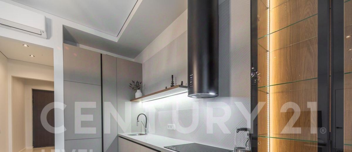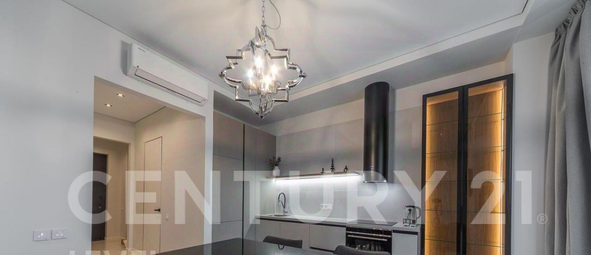 Полностью меблирована, установлена кухня со всей необходимой техникой, стиральная машина с сушкой, установлены кондиционеры.