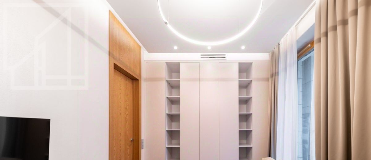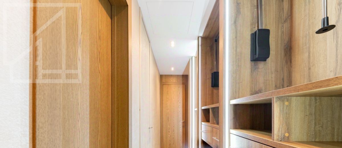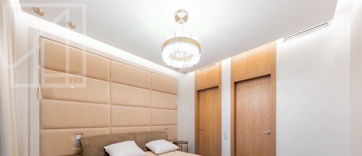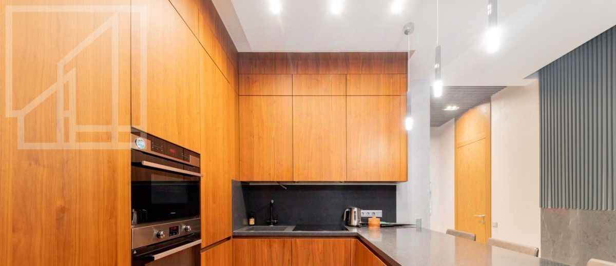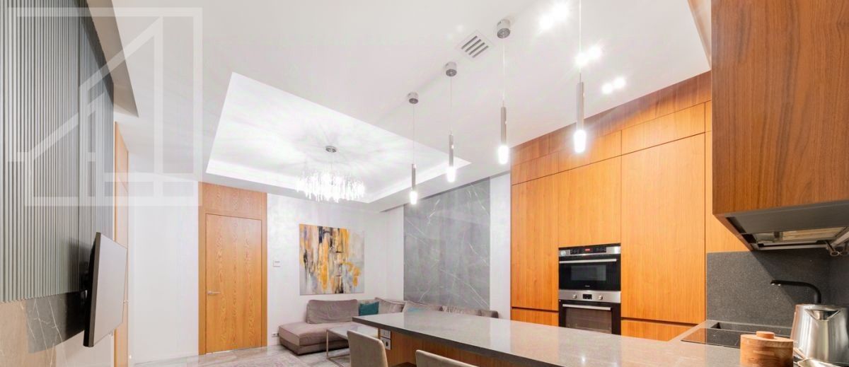 Планировка: кухня-гостиная, 2 спальни, 2 ванные комнаты, 2 гардеробные, холл. Апартамент полностью укомплектован современной мебелью, кухня оснащена встроенной техникой премиум-класса. Выполнена премиальная дизайнерская отделка с использованием натурального дерева и крупного керамогранита. Светлый интерьер оформлен в современном стиле, украшен картинами и авторскими светильниками. Установлена система кондиционирования. Из окон открывается живописный вид на Никольскую церковь.