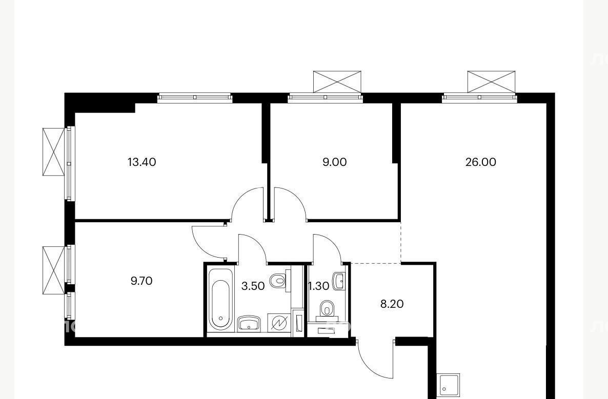 изолированные спальни, просторную кухню -гостиную, площадью 26 кв.м. и два раздельных санузла.