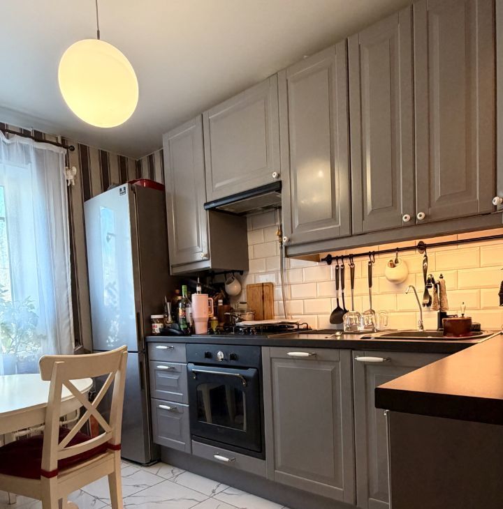 Кухня полностью оборудована, газовая плита в компании с электрическим духовым шкафом Hotpoint Ariston, посудомоечная машина Bosch (Германия), вытяжка Elikor с выходом в вентиляцию, холодильник Samsung, и микроволновка LG.