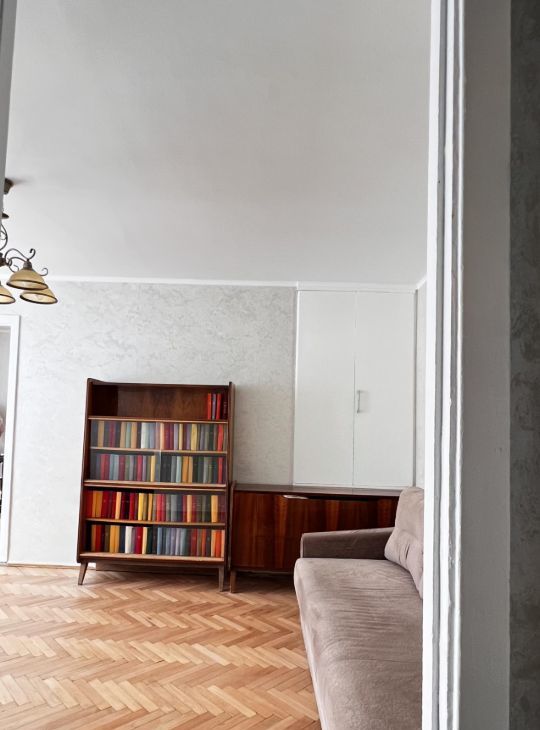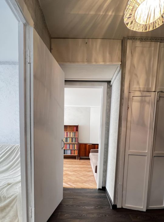 Комнаты:— Первая комната: раскладной диван, книжные полки, платяной шкаф, кондиционер.— Гостиная: большой раскладной диван, книжный шкаф, раздвижной стол, два функциональных шкафчика для хранения, встроенный шкаф с тремя крупными полками и отделением для одежды.— Третья комната: кровать, платяной шкаф, тумбочка.