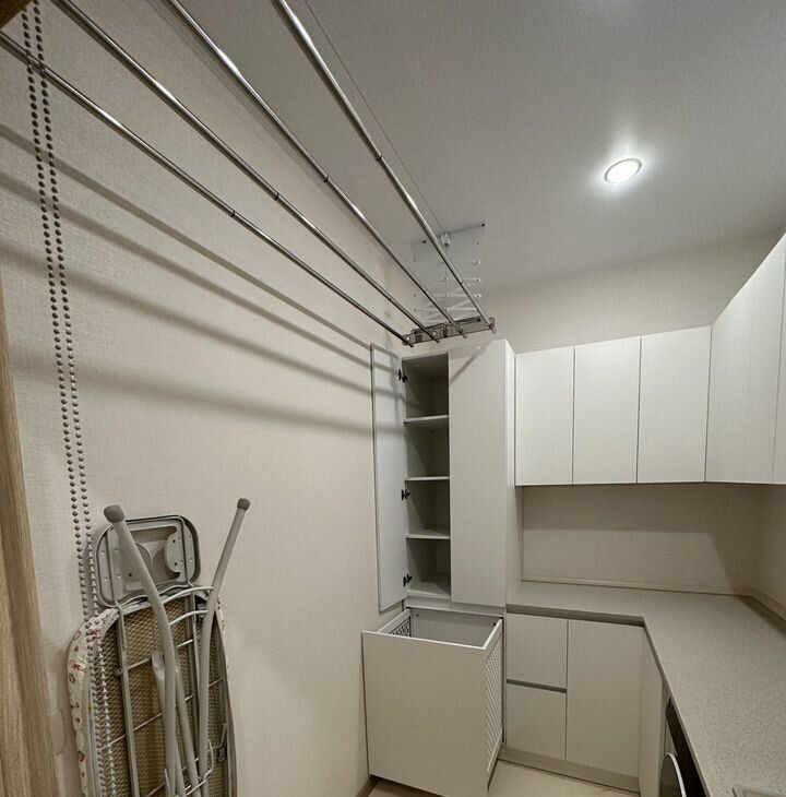 Отдельная прачечная комната со встроенным ящиком для грязного белья, функциональной поднимающейся/опускающейся вешалкой для сушки белья, стиральной/сушильной машиной, гладильной доской и множеством ящиков для постельного белья, полотенец и всех принадлежностей для уборки, глажки, стирки. Два полноценных сан. узла: один с широкой, вместительной ванной; второй с полноценной душевой кабиной.