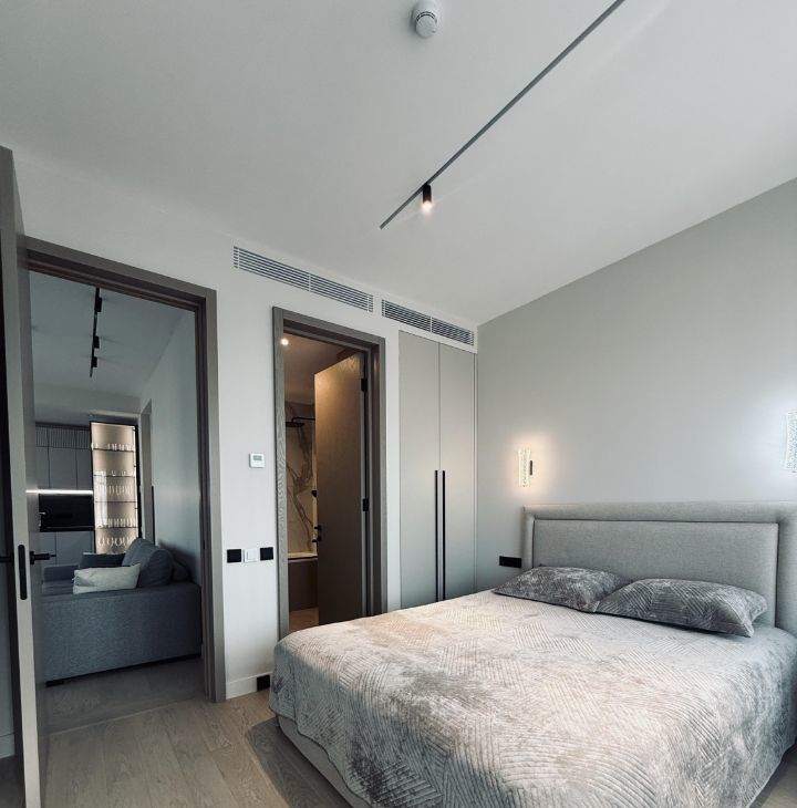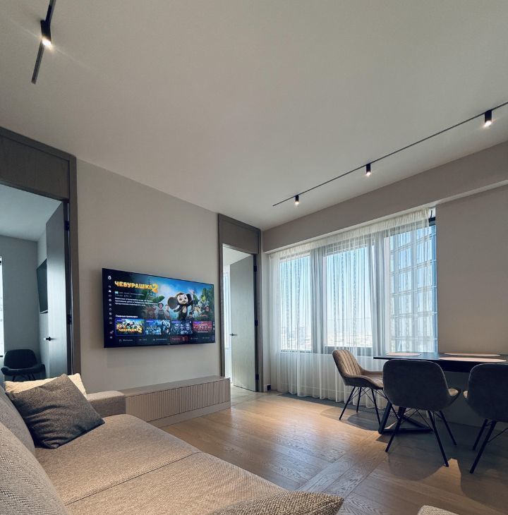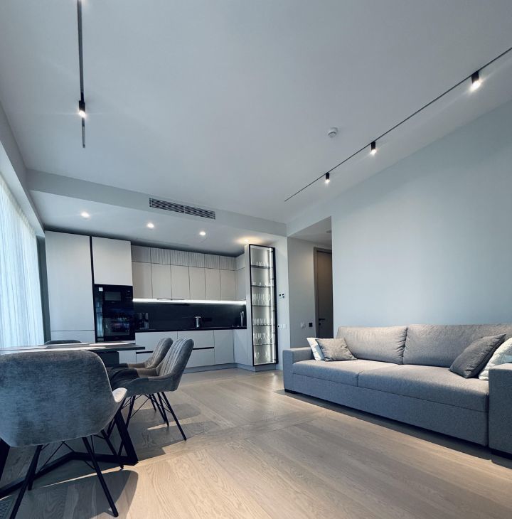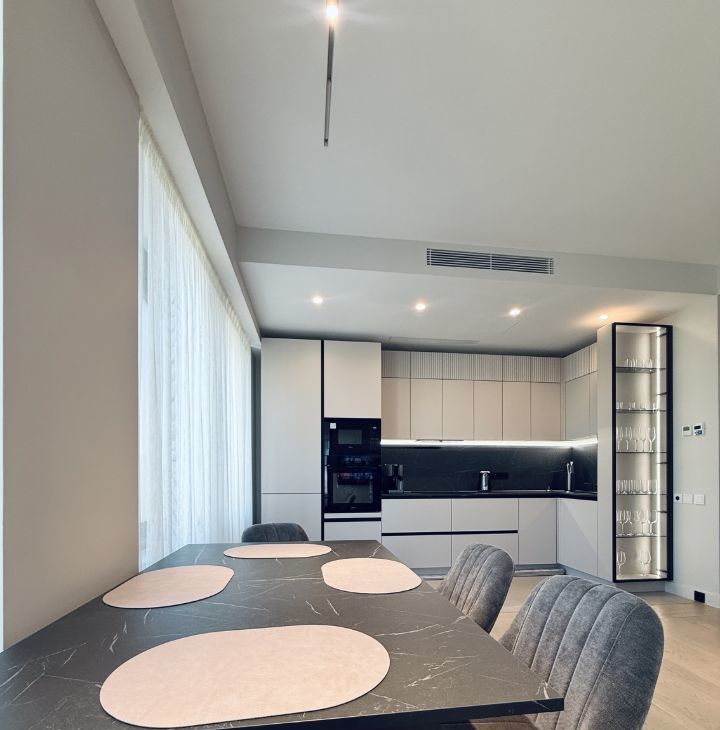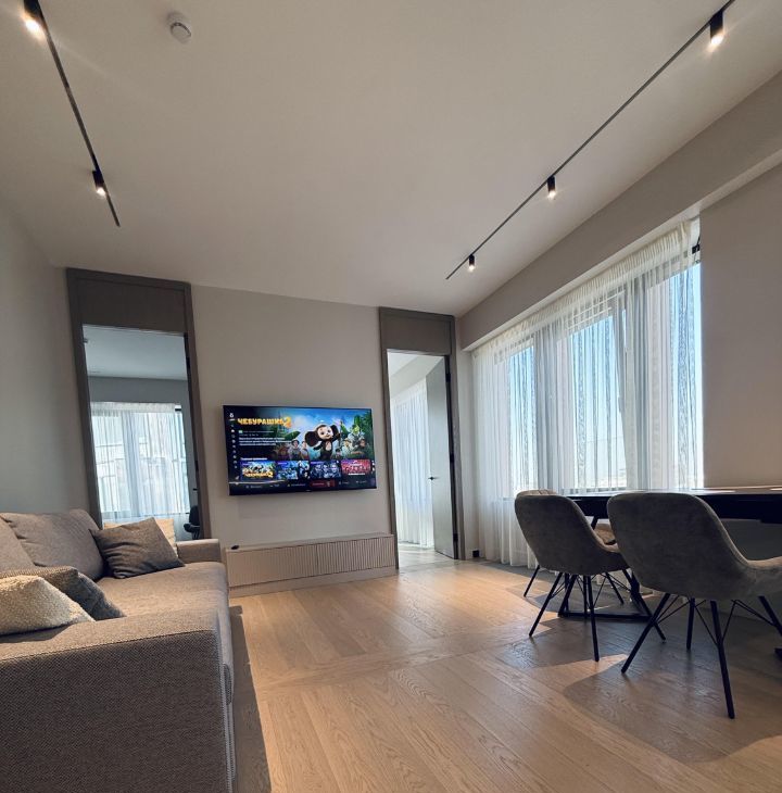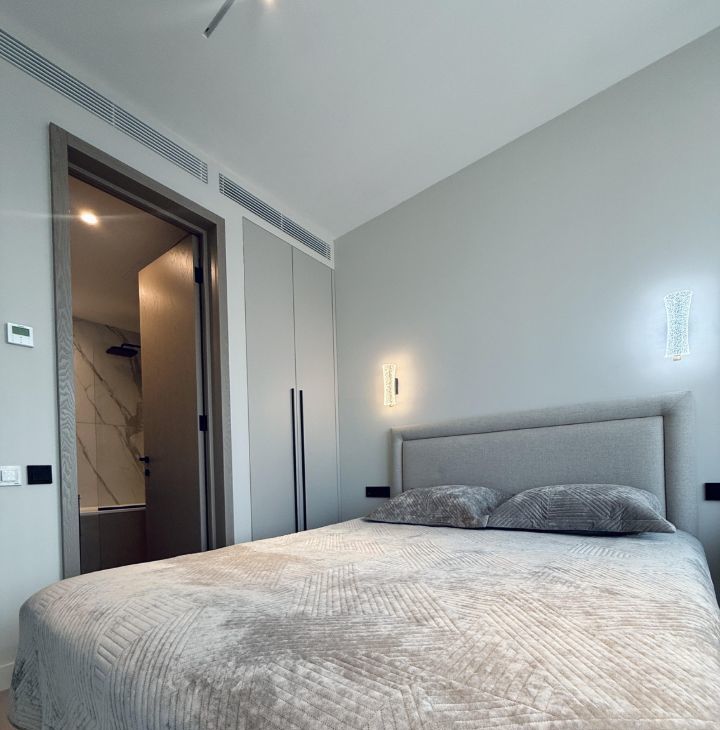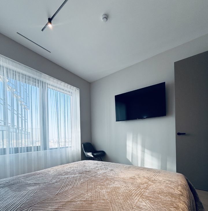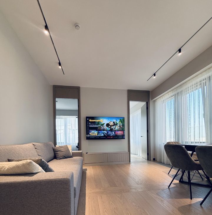 Симфония 34. Дизайнерский ремонт, совершенно новые мебель и бытовая техника, высокие потолки, центральные вентиляция и кондиционирование, две изолированные спальни, одна из них с собственным санузлом, кухня-гостиная, прихожая с системой хранения, гостевой санузел, два совмещенных санузла, один с ванной, другой с душевой, "Умный дом". В квартире никто не жил, ранее не сдавалась.