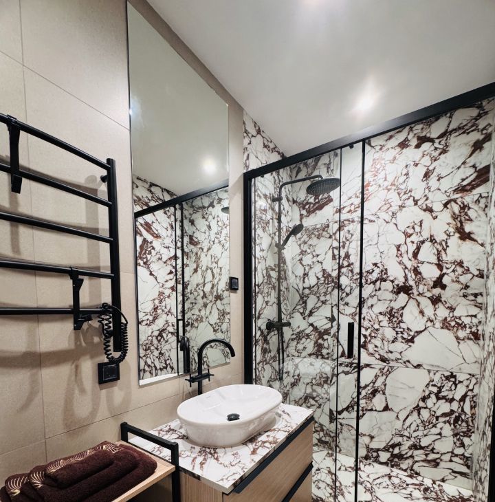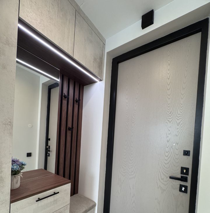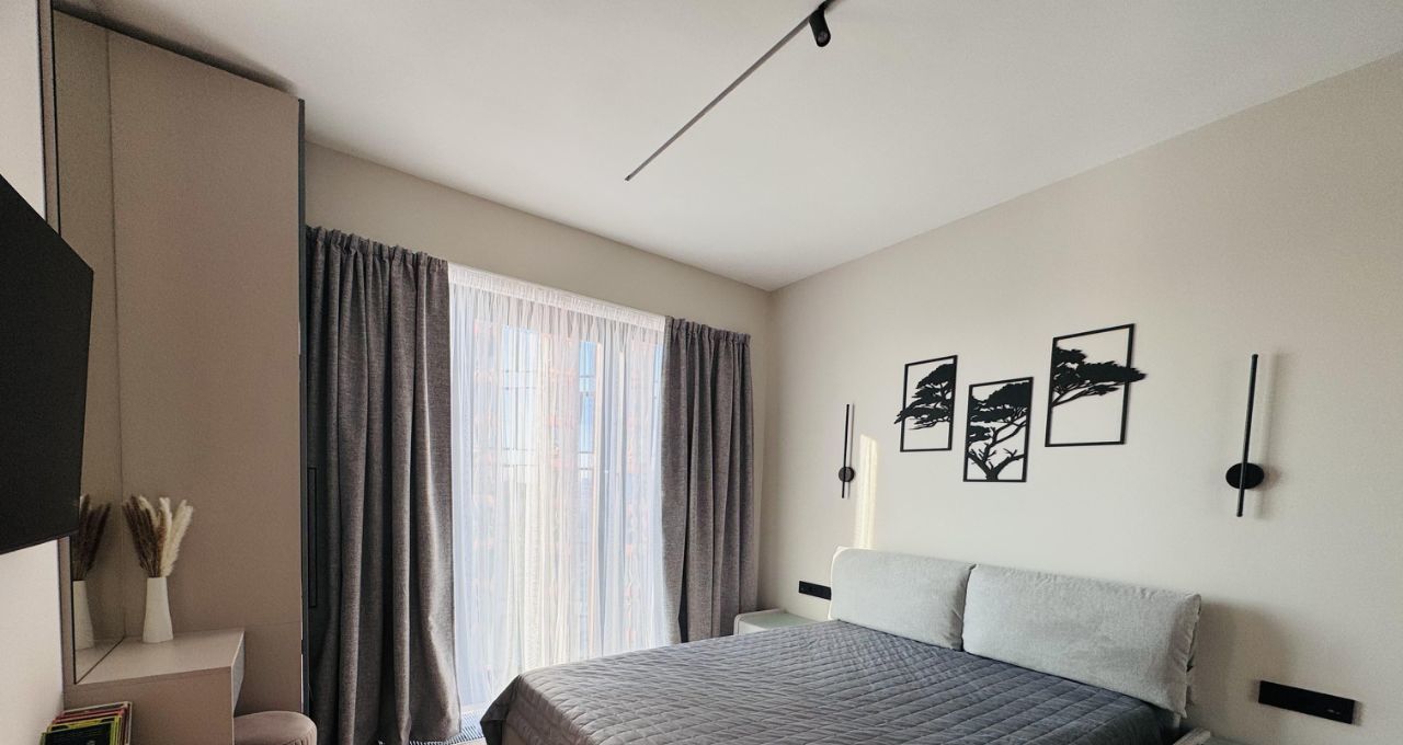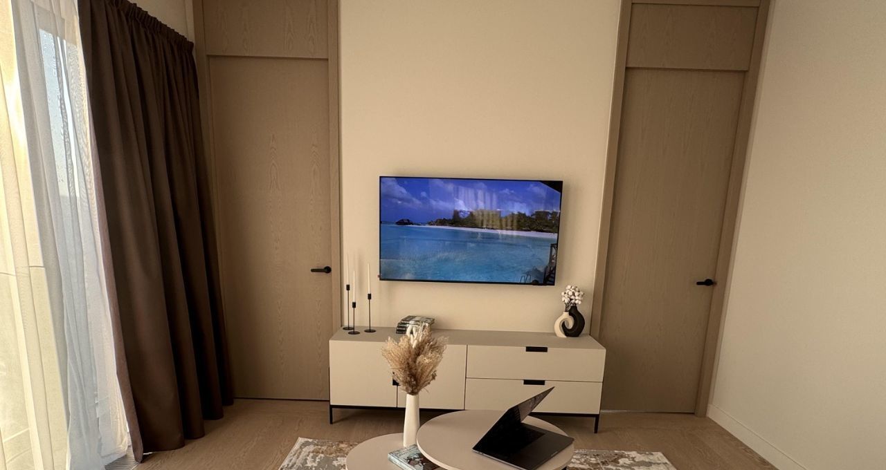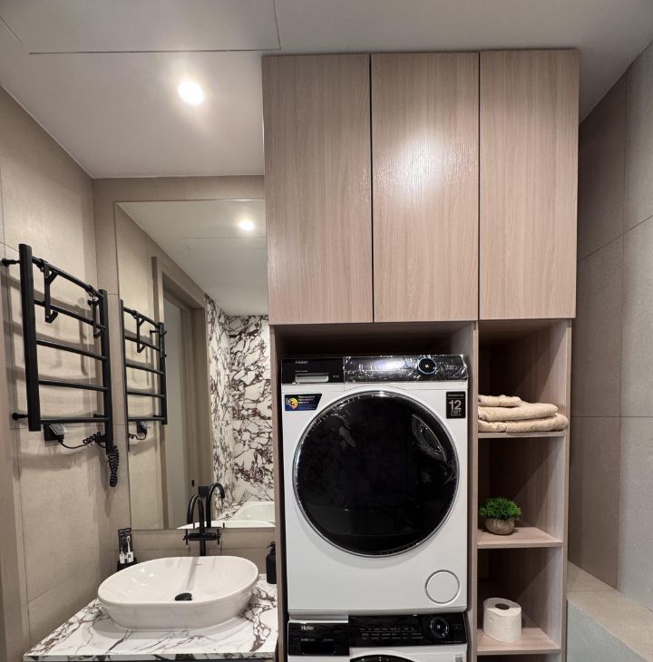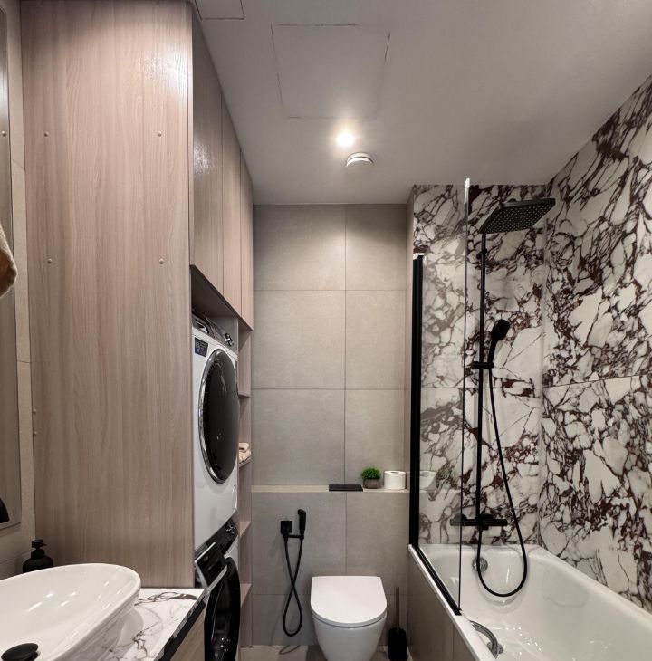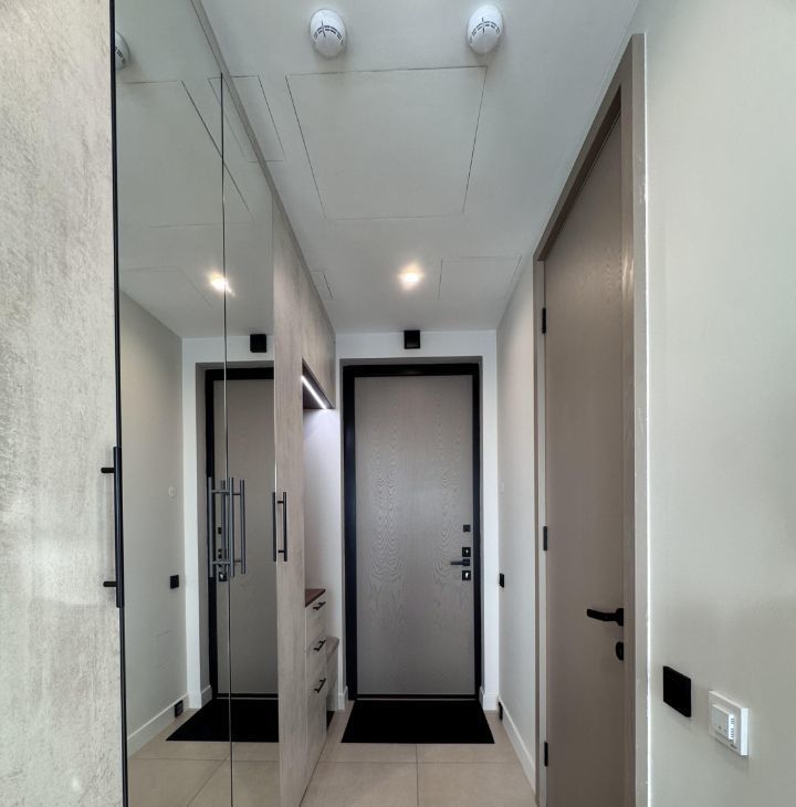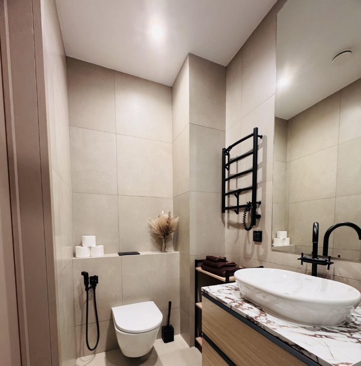 Функциональная планировка: кухня-гостиная, прихожая с системой хранения, два совмещенных санузла, один с ванной, другой с душевой, изолированная спальня и вторая комната свободного назначения. Формат удобен для пары, для семьи с ребёнком или арендатора, работающего удалённо.
