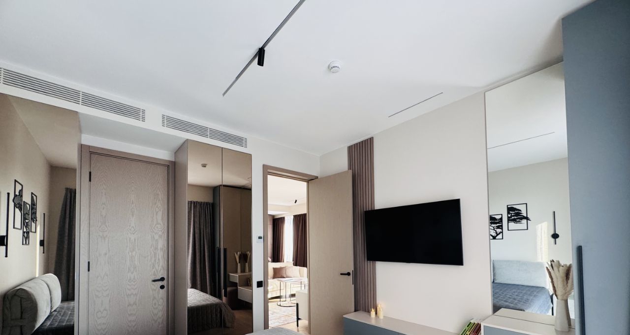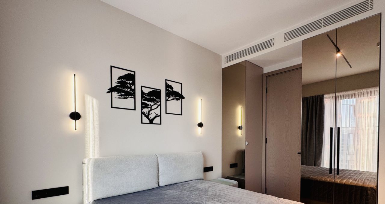 Совершенно новые мебель и бытовая техника, высокие потолки, панорамные окна, центральные вентиляция и кондиционирование, система Умный дом. В квартире никто не жил, ранее не сдавалась.