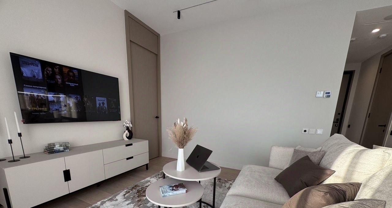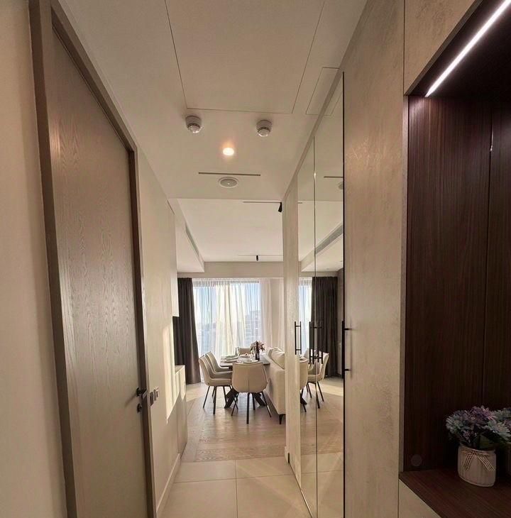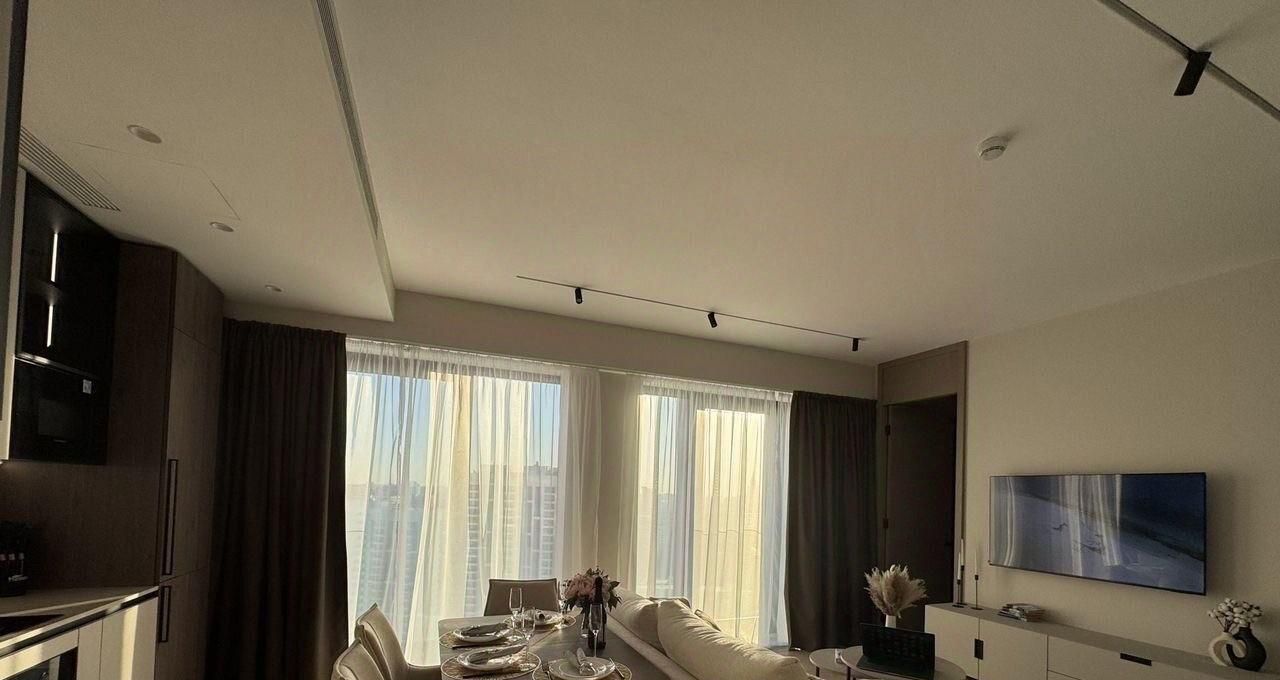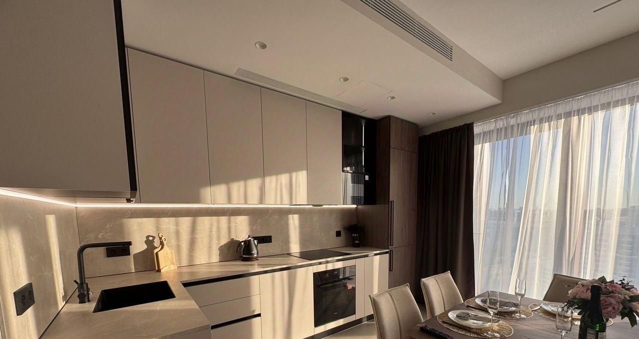 Совершенно новые мебель и бытовая техника, высокие потолки, панорамные окна, центральные вентиляция и кондиционирование, система Умный дом. В квартире никто не жил, ранее не сдавалась.
