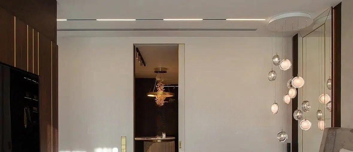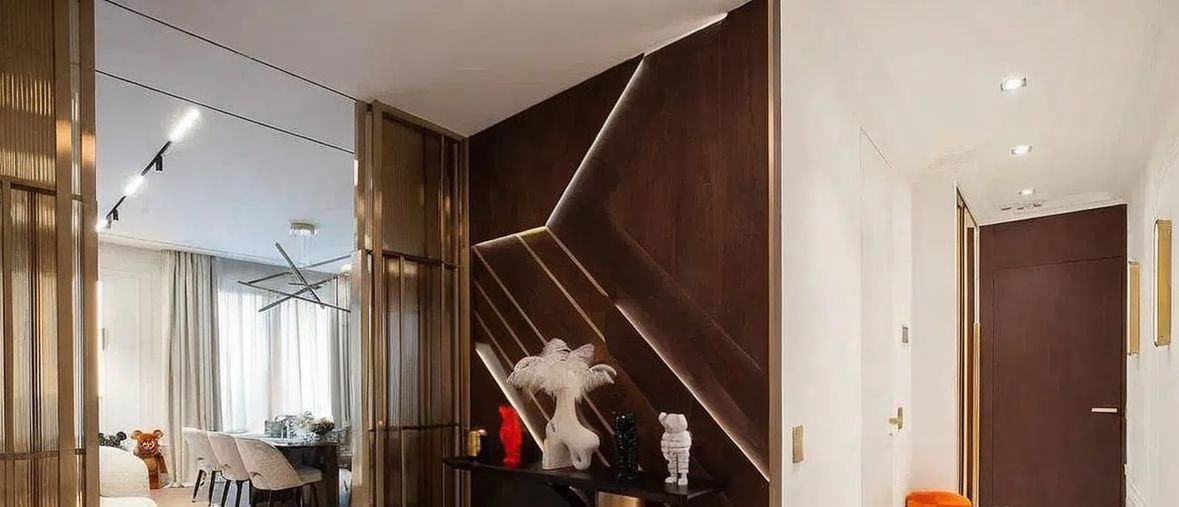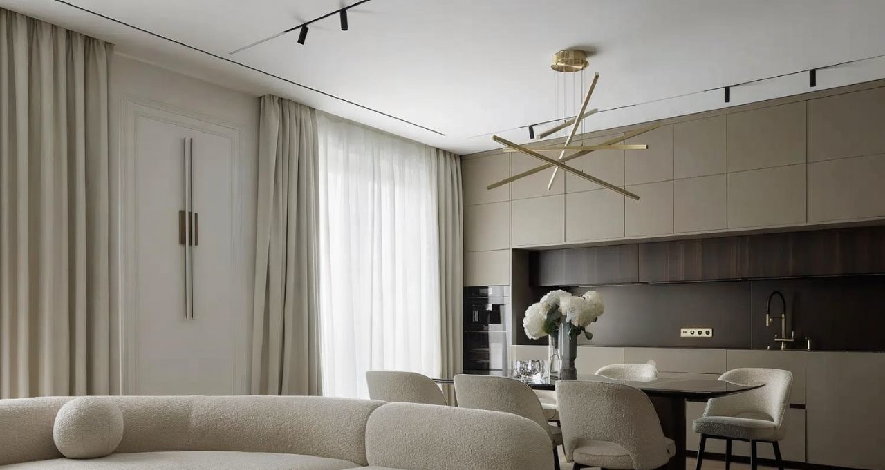 Гостиная зонирована на комфортные функциональные пространства. Здесь - мраморная декоративная стена с интегрированной дверью, паркет из американского ореха, светильники итальянских брендов, акустика Bang Olufsen, ковёр из шёлка ручной работы, диван и кресло Eichholtz. В обеденной зоне — мраморный стол и стулья Casa Milano.