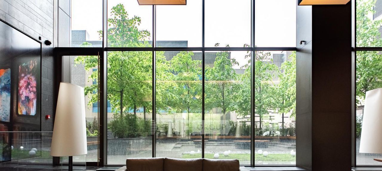Выполнено панорамное остекление, окна выходят во двор.
