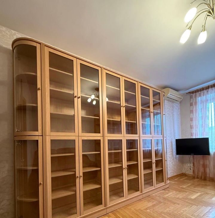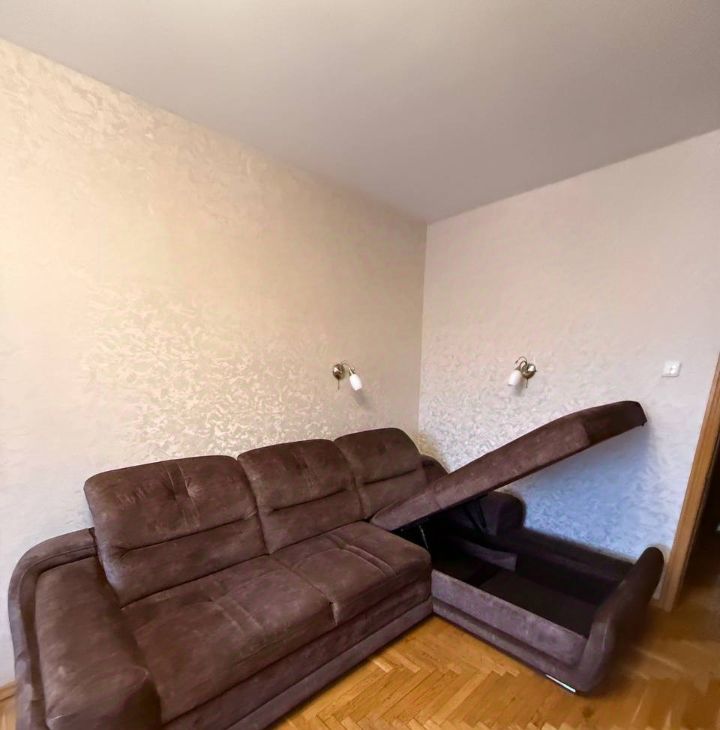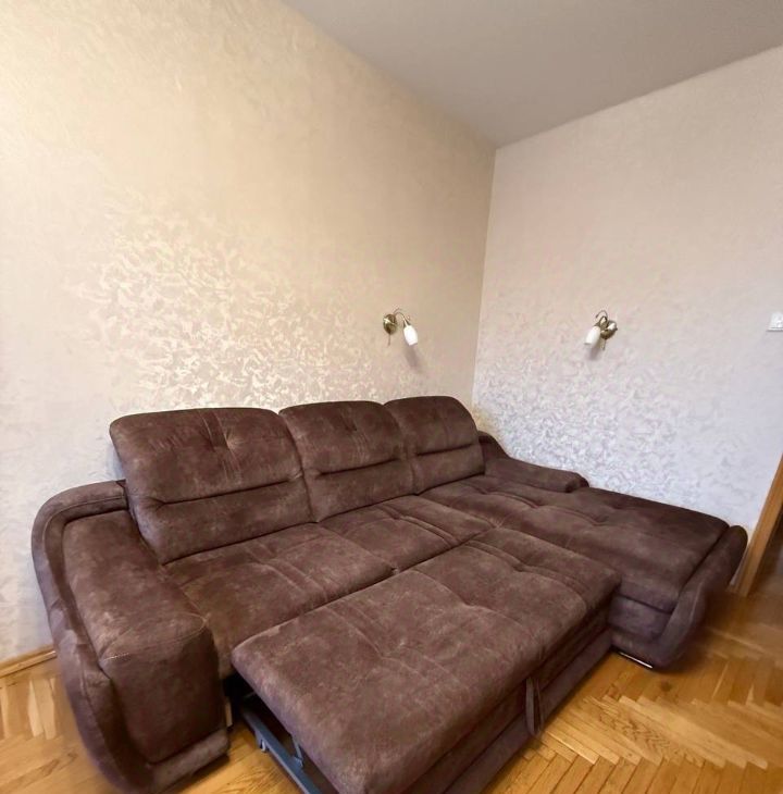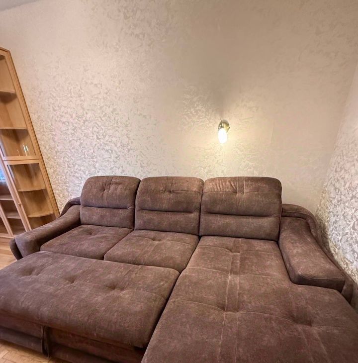 В гостинной имеется удобный большой раздвижной диван, для вашего полноценного отдыха или просмотра тв перед сном, так же в гостиной имеются два больших шкафа для книг или других личных вещей.