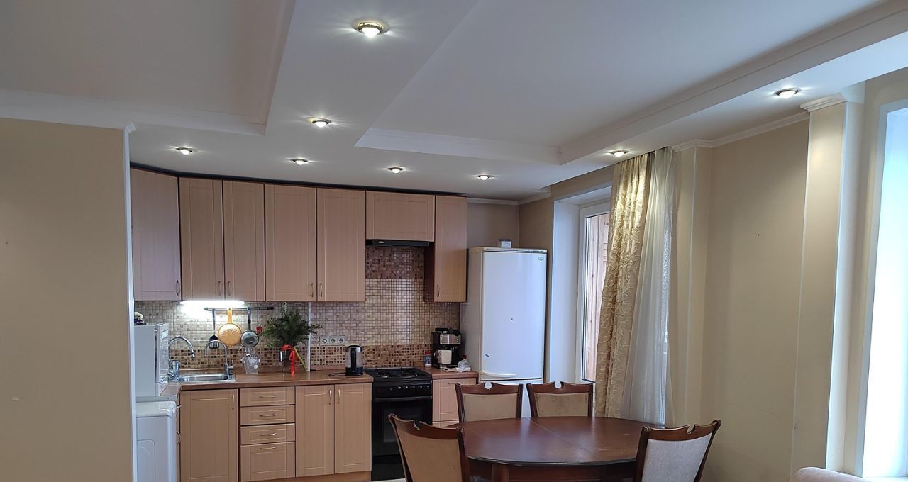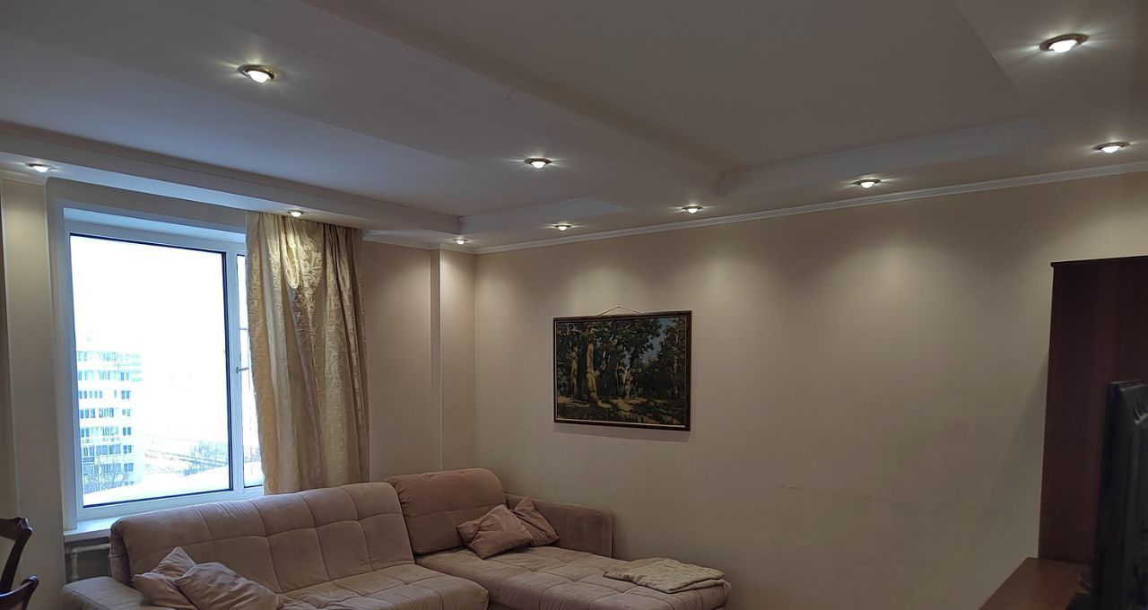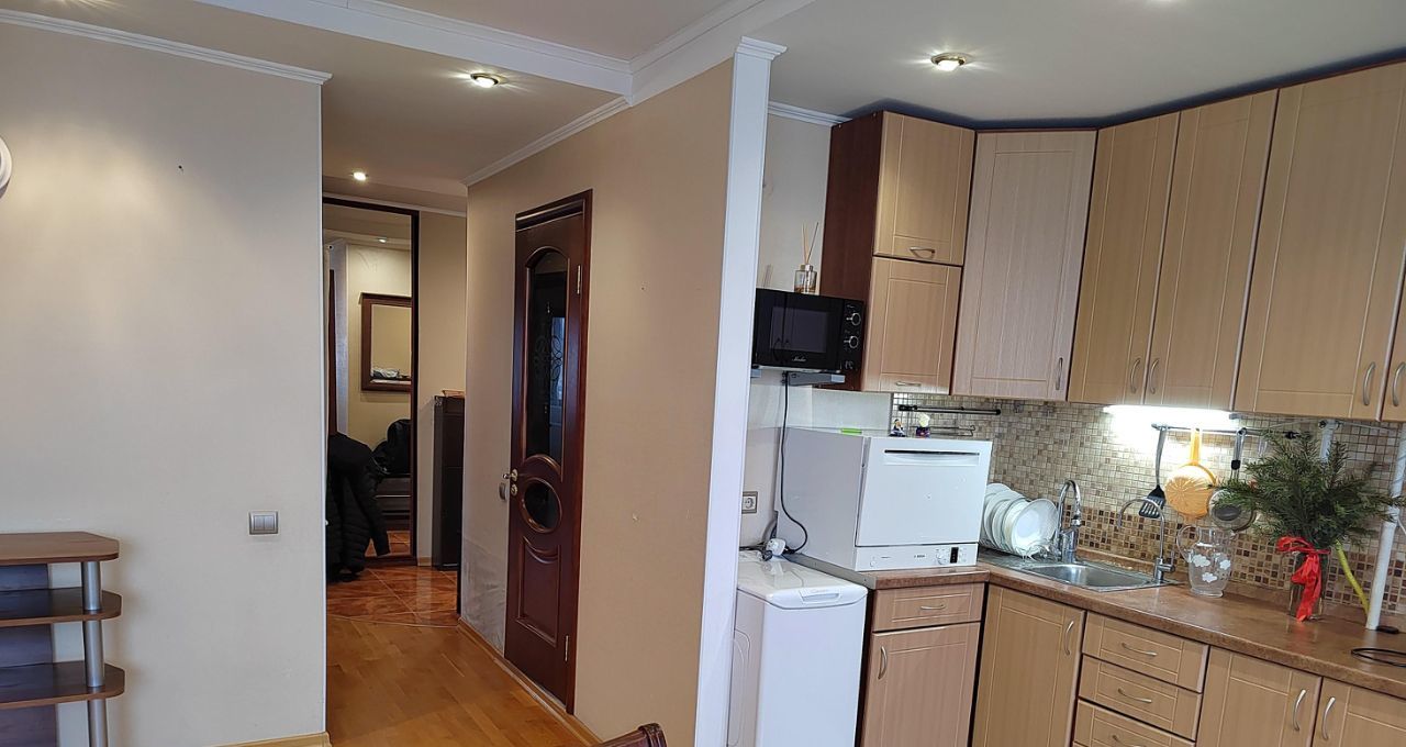 Сдаётся уютная трёхкомнатная квартира общей площадью 66 кв. м на последнем, 12-м этаже блочного дома, построенного в 1971 году. Жилая площадь составляет 45 кв. м, а высота потолков — 2,64 метра.