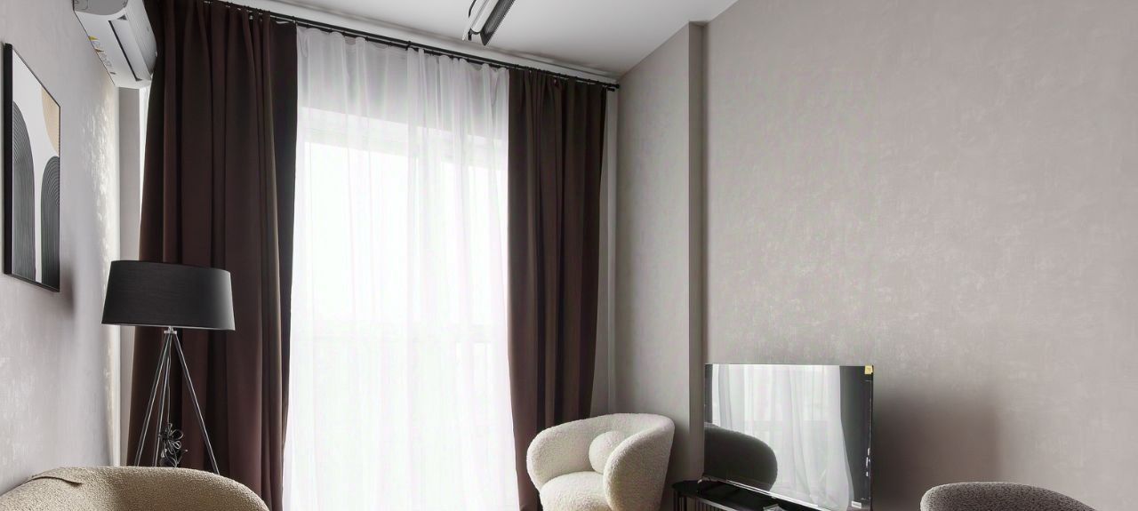 Квартира в светлых тонах с кухней, кабинетом и спальней. В ней есть вся мебель и техника дл комфортной жизни: кухонный гарнитур, диван и кресло в обивке букле, раскладной диван в красивом терракотовом оттенке, обеденная группа с каменной столешницей, два шкафа в каждой комнате, журнальный столик и другие элементы декора. Из техники: духовой шкаф, посудомоечная машина, стиральная машина, телевизор с широким экраном, индукционная плита на 4 конфорки, вытяжка.