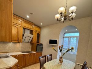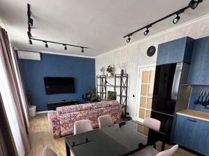 В квартире сделан современный евроремонт. Есть вся необходимая мебель на кухне и в комнате. Из техники: кондиционер, холодильник, телевизор, стиральная и посудомоечная машины. Планировка включает совмещённый и отдельный санузлы