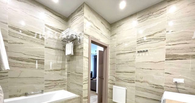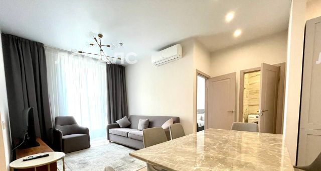 В квартире сделан современный евроремонт. Есть вся необходимая мебель на кухне и в комнате. Из техники: кондиционер, холодильник, телевизор, стиральная и посудомоечная машины. Планировка включает совмещённый и отдельный санузлы