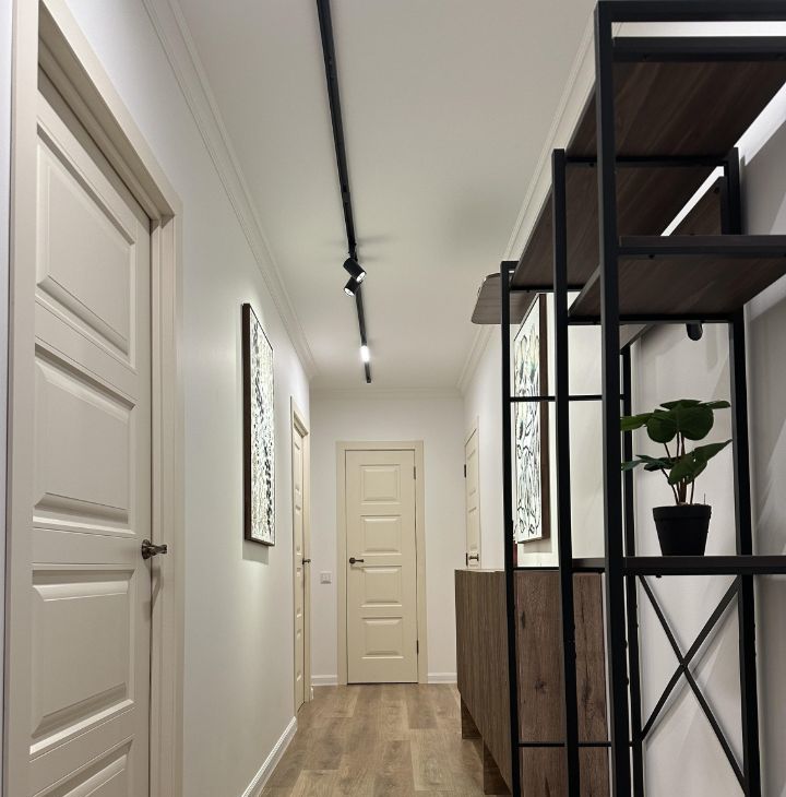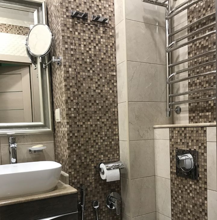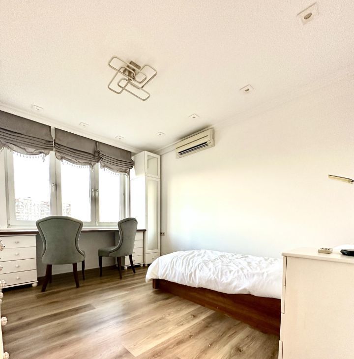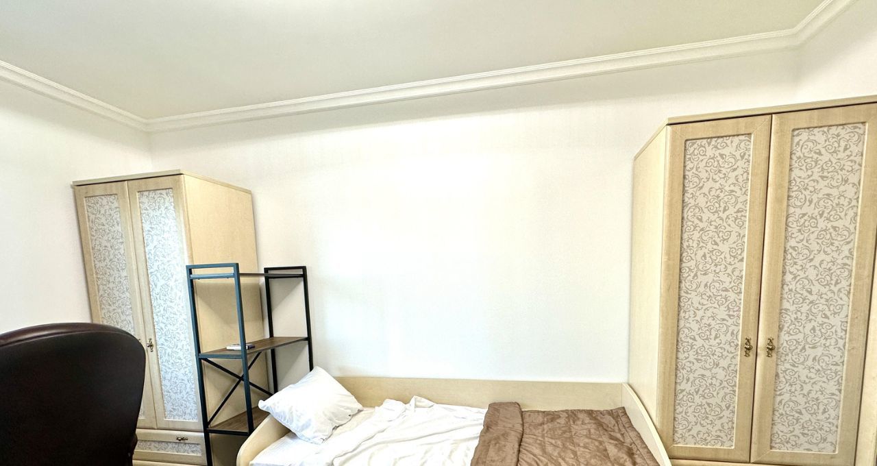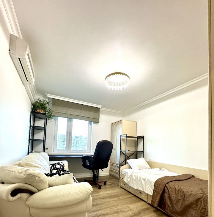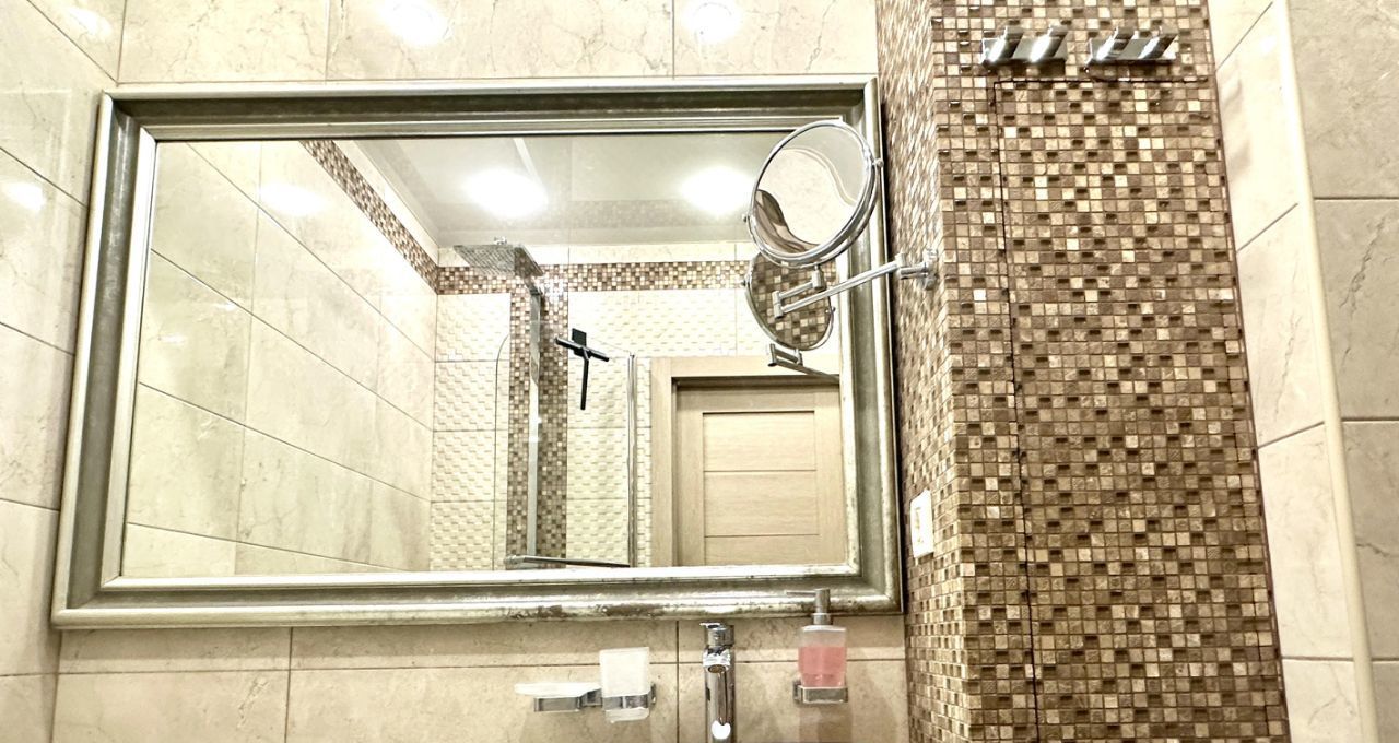Удобный совместный санузел оборудован датчиками протечки воды, есть ванна и гигиенический душ. Присутствует вся мебель и техника, необходимые для жизни.