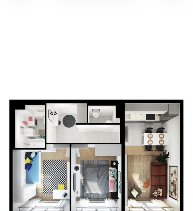 Просторная кухня-гостинная, две одинаковые изолированные комнаты, ГОСТЕВОЙ САНУЗЕЛ.