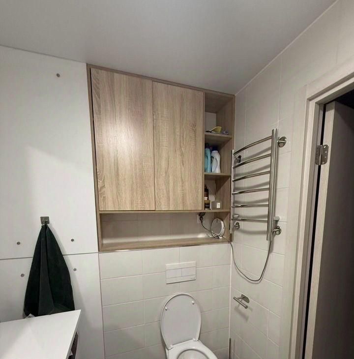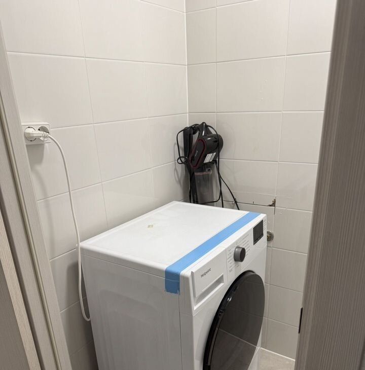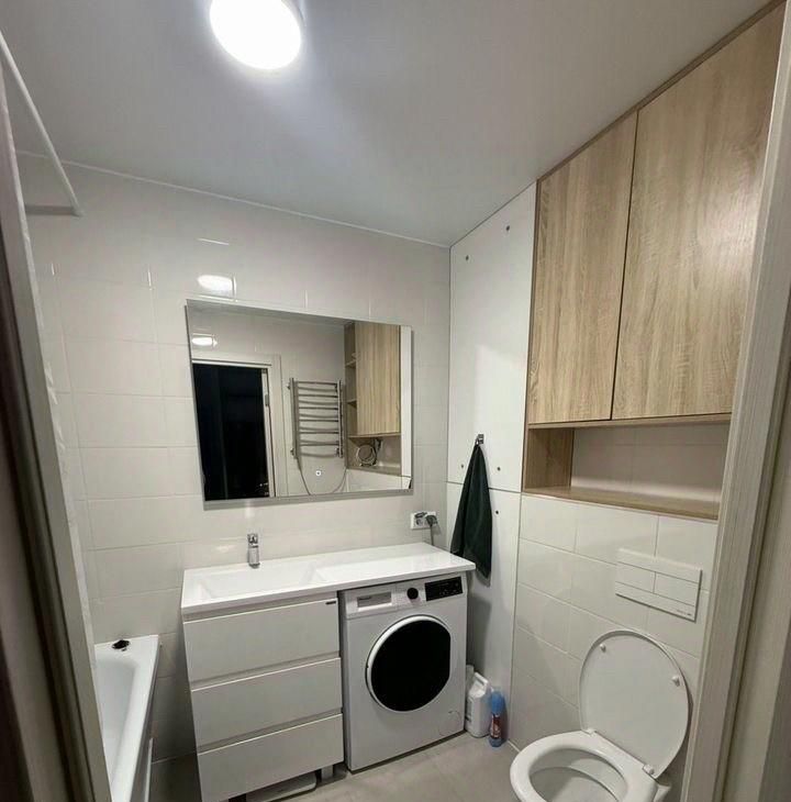 В спальне есть двуспальная кровать и вместительные шкафы. Ванная комната совмещенная со стиральной машиной.
