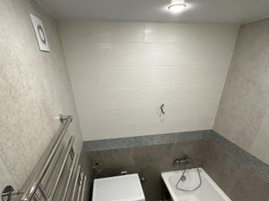 * Раздельный санузел: современная плитка, подвесной унитаз, инсталляция Geberit, чугунная ванная.