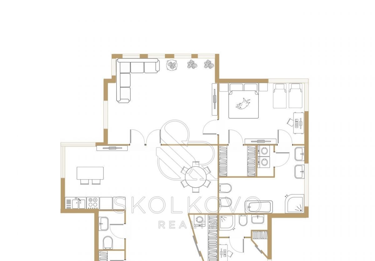 Современное планировочное решение: открытая кухня, объединенная с гостиной и столовой, изолированные спальни, а также две ванные комнаты, оборудованные по последнему слову техники.