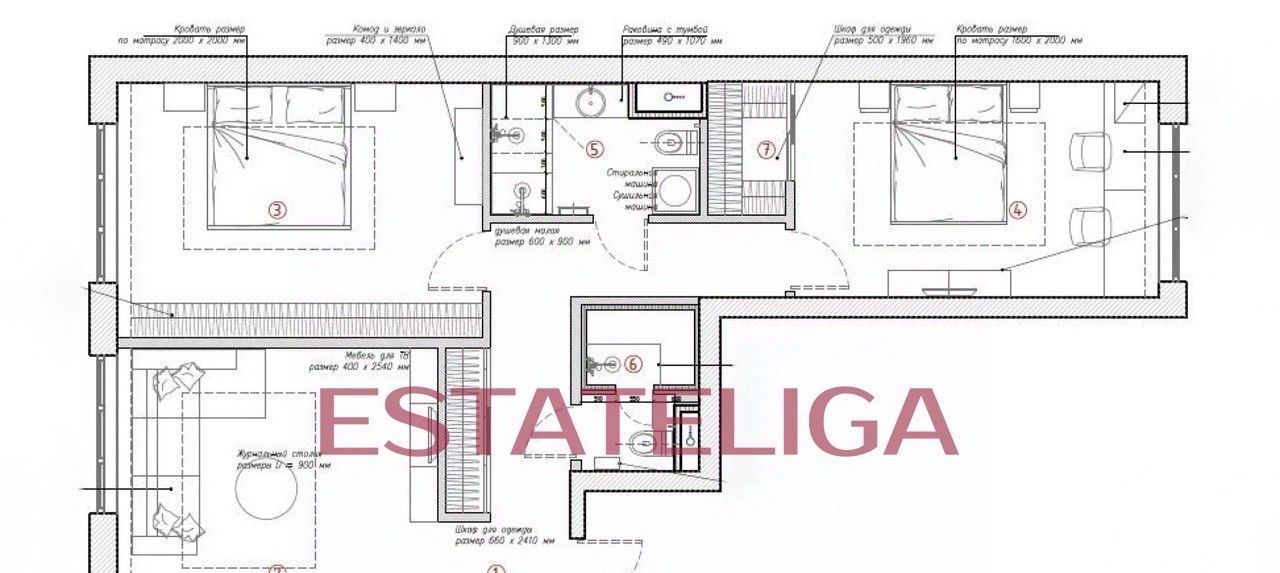 Функциональная планировка квартиры: просторная гостиная, плавно перетекающая в кухню, просторная спальная комната, вторая спальная комната с рабочей зоной и гардеробной, два совмещенных санузла, один из них с полноценным хаммамом, холл с местами для хранения, отдельная гостевая гардеробная.