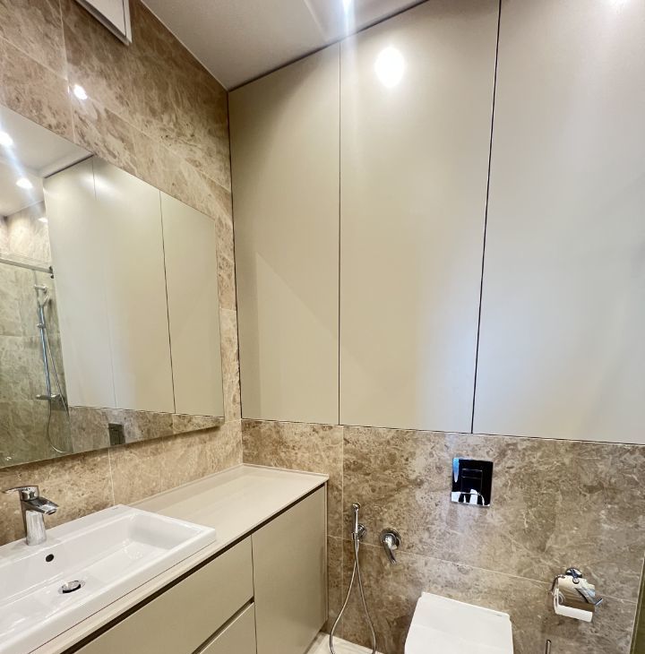 - в спальнях встроенные системы хранения, кровати с ортопедическим основанием, тумбы, разные сценарии освещения.