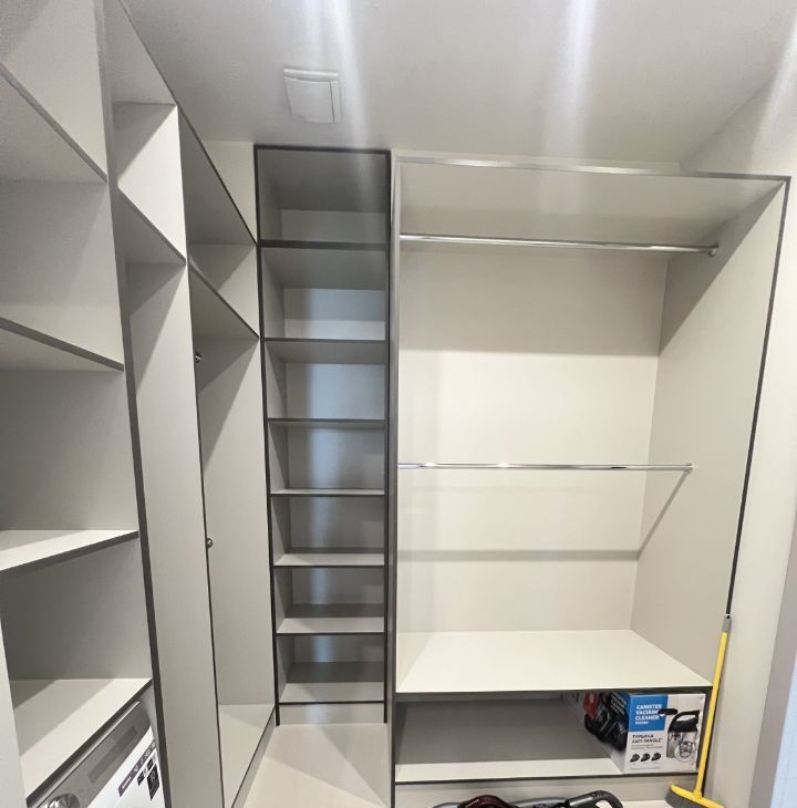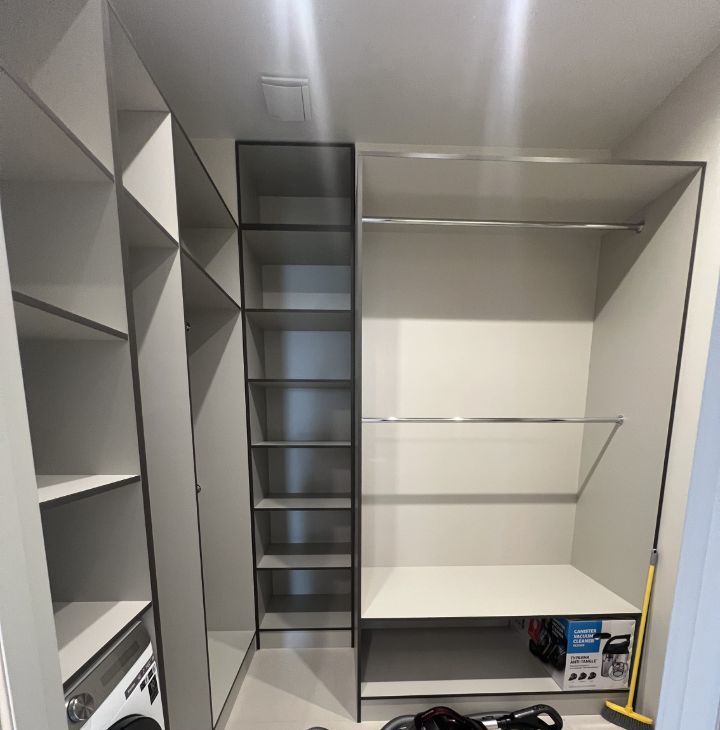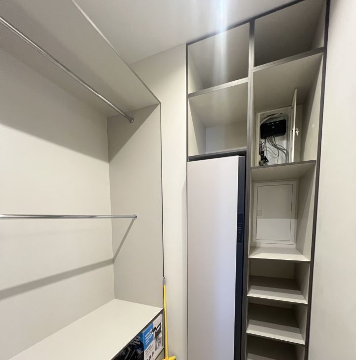 Большая гардеробная с встроенной стиральной машиной, пылесос, профессиональный сушильный шкаф, системы хранения.