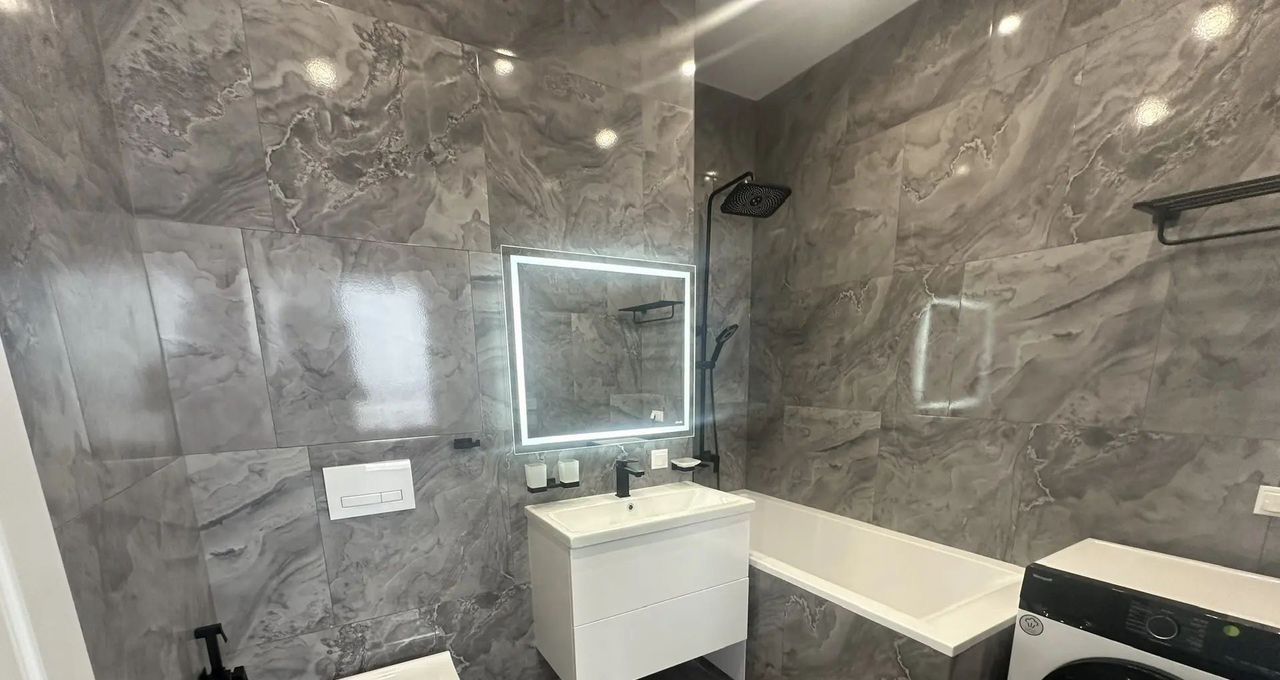 В квартире есть всё необходимое для комфортного проживания: современная мебель на кухне и в комнатах, а также вся необходимая техника — кондиционер, холодильник, посудомоечная и стиральная машины, телевизор. Два совмещённых санузла оборудованы ванной и обеспечивают максимальное удобство для всей семьи.