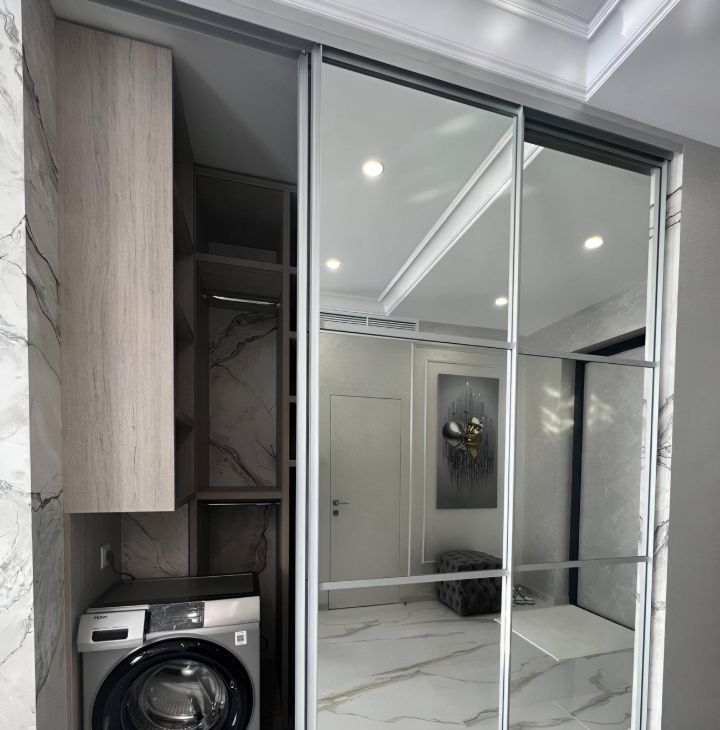 Большая гардеробная с встроенной стиральной машиной, пылесос, системы хранения.