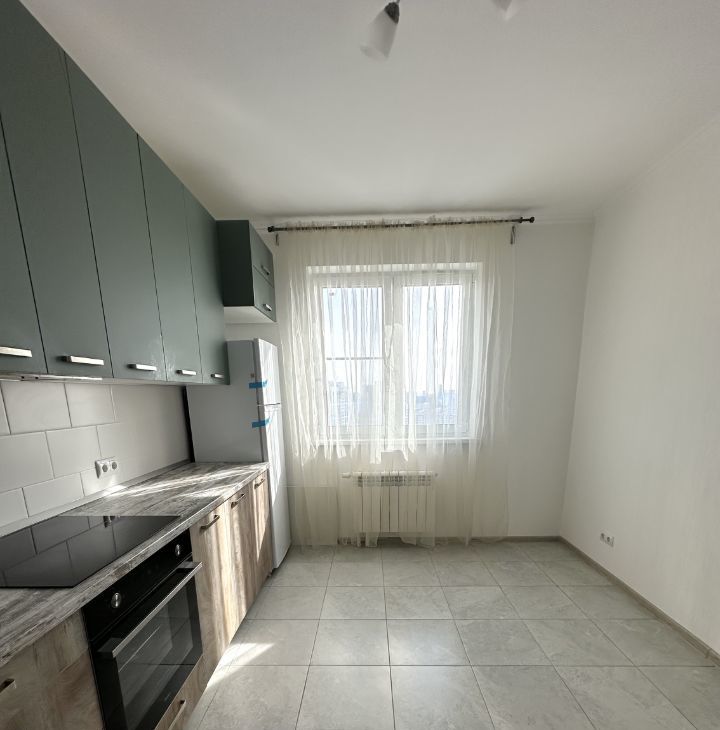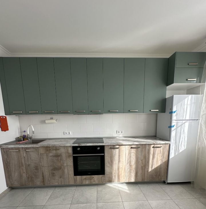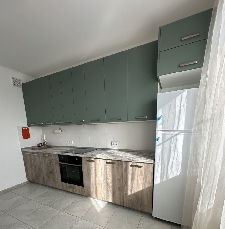 В квартире установлен новый кухонный гарнитур с вытяжкой, плитой-панелью и духовкой, есть холодильник и стиральная машина.